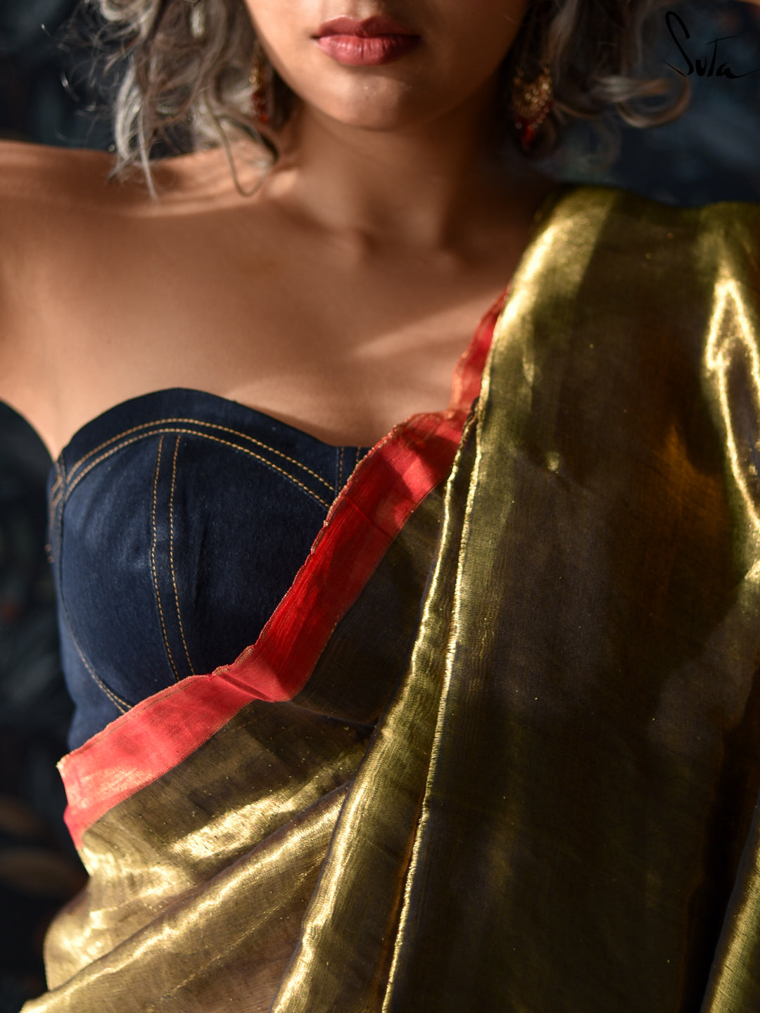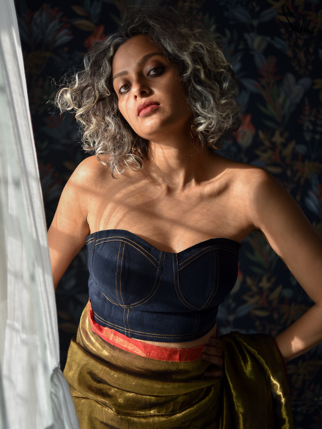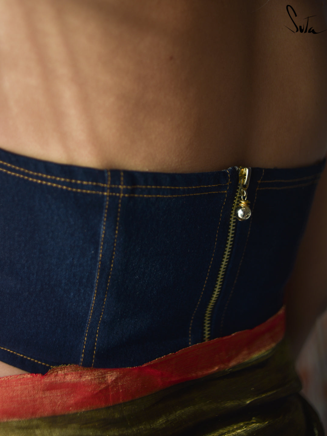 Country Blue Bliss, a stunning blouse inspired by classic corsetry, featuring a flattering fitted silhouette with structured seams that define the waist. The strapless design and sweetheart neckline add a timeless, feminine touch, while the back zip ensures a secure and comfortable fit. The deep blue hue radiates sophistication, and the contrasting yellow stitch lines provide a playful pop of color. Crafted from high-quality material, this blouse offers both structure and comfort, making it perfect for all-day wear. The corset-inspired design cinches the waist, creating an elegant, hourglass shape.