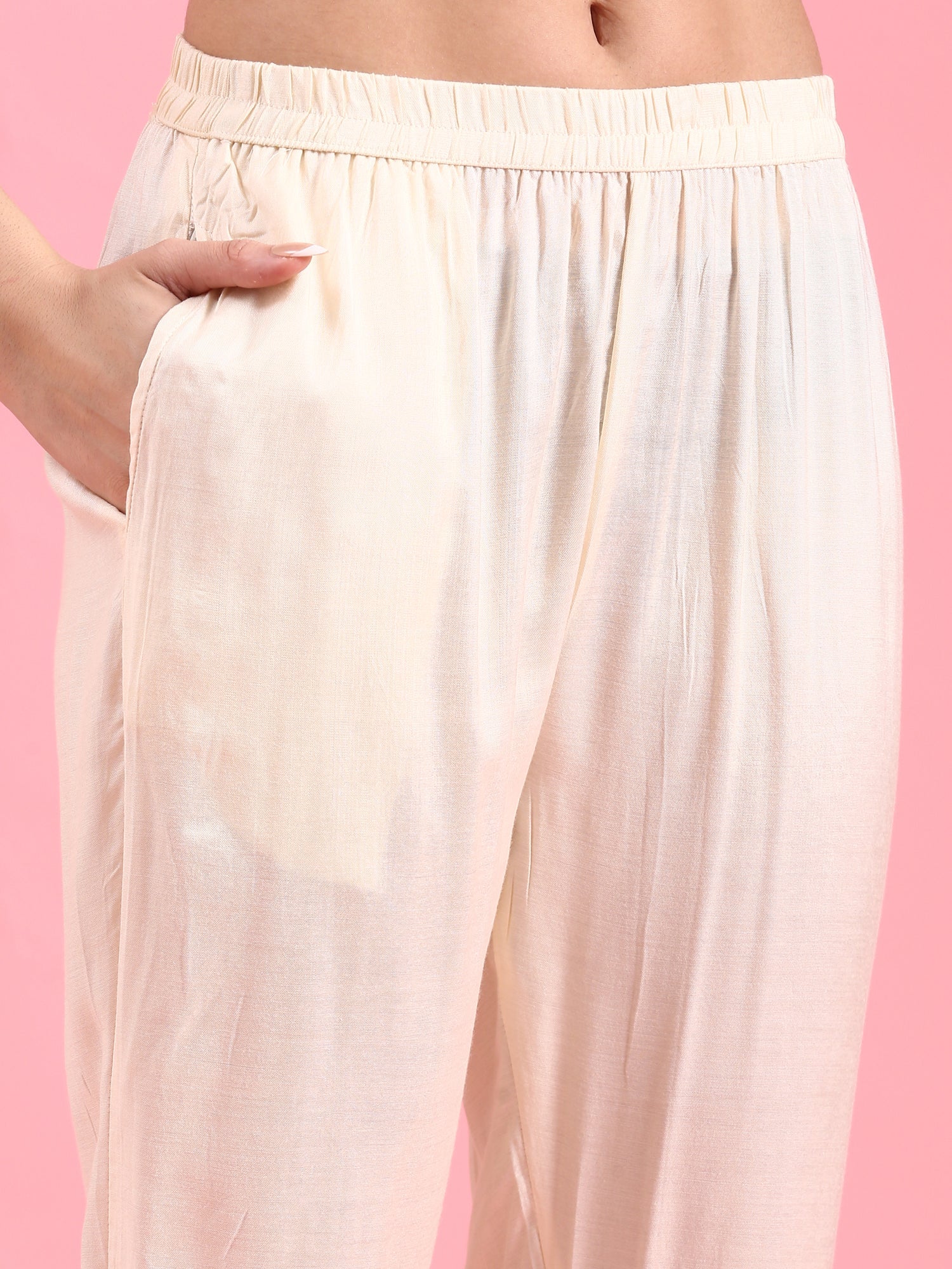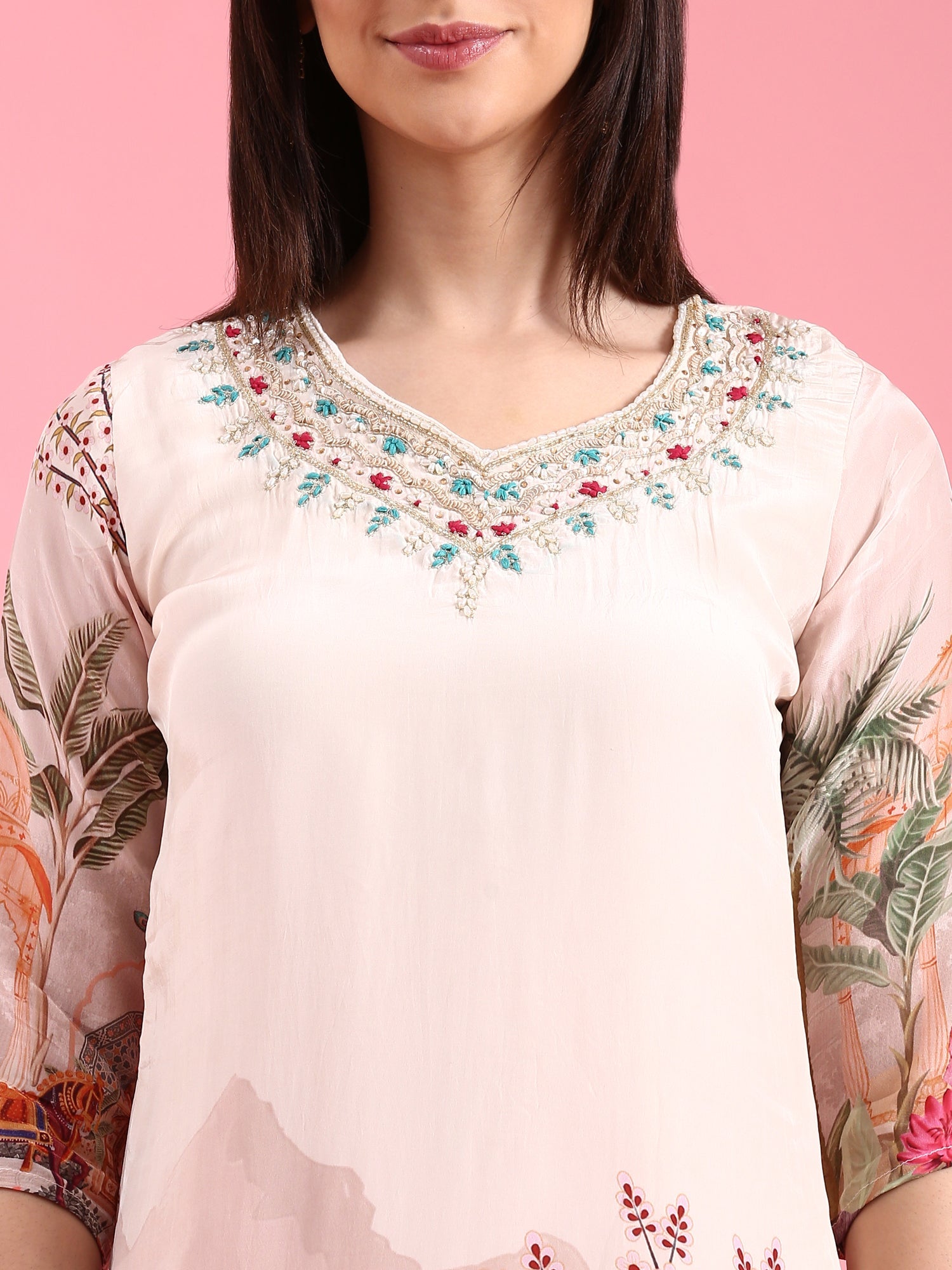 Cream Crepe Printed Embroidery Three Piece Suit Set