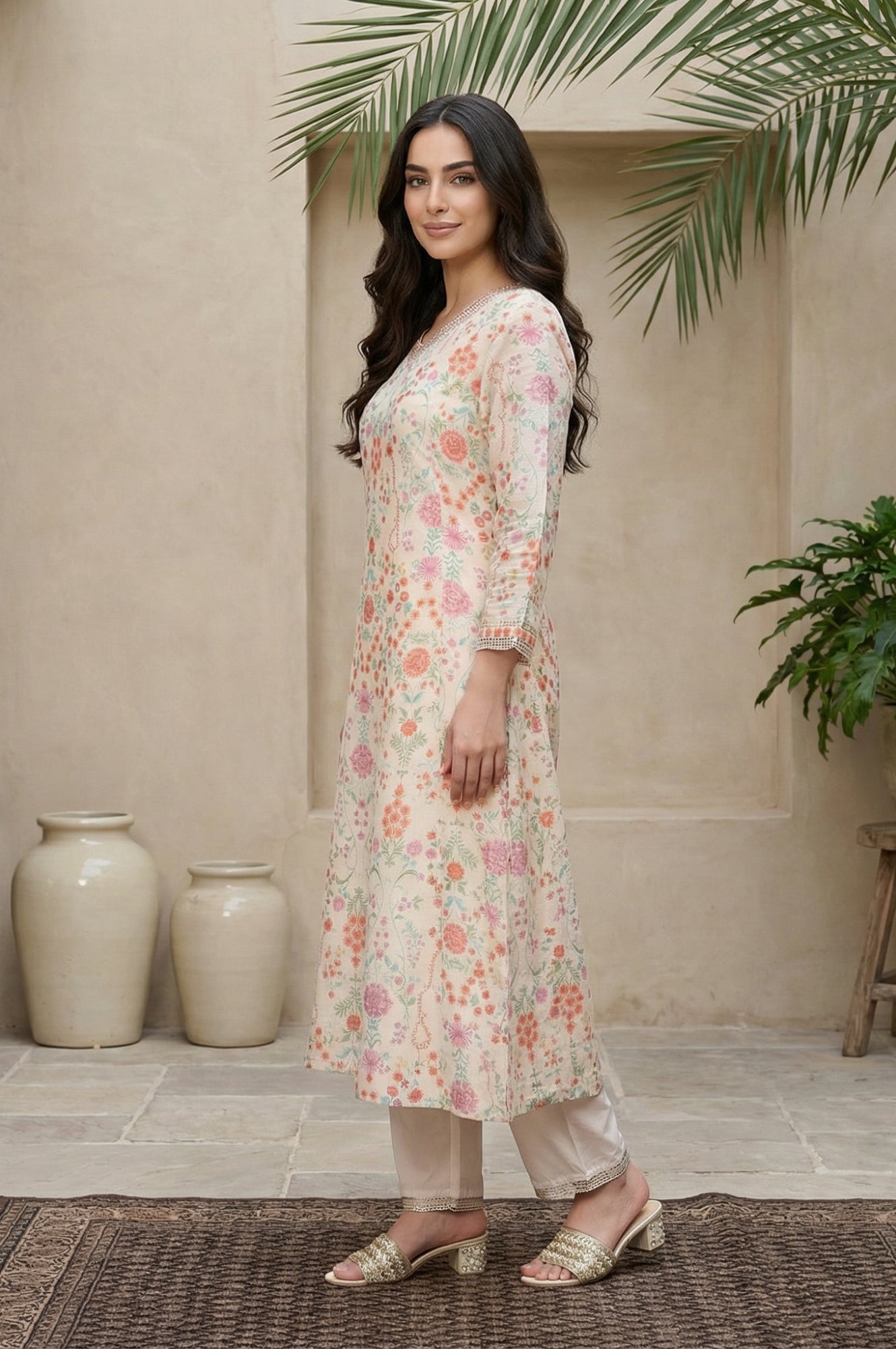 A timeless blend of elegance and charm, this cream floral printed kurta set is crafted from premium tissue fabric. The A-line kurta features a V-neckline and three-quarter sleeves, adorned with intricate floral prints. Paired with straight pants and a solid dupatta, this ensemble is perfect for festive occasions. The lightweight fabric ensures comfort, while the straight hemline and elasticated waistband add practicality. A must-have for your ethnic wardrobe, this set exudes sophistication and grace.