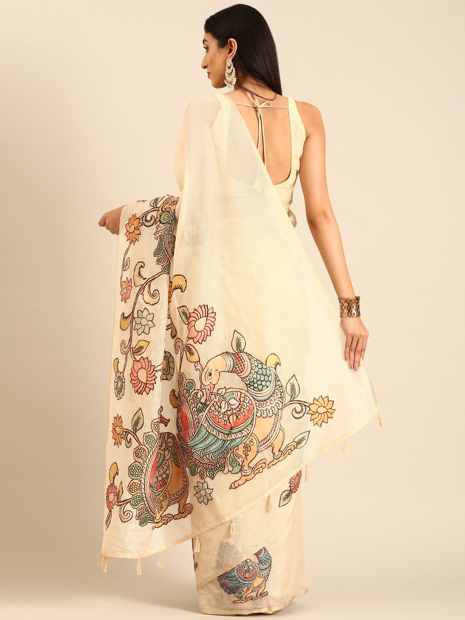 Experience elegance with this cream kota saree featuring intricate kalamkari appliqué work on the pallu. Its lightweight, breathable fabric ensures comfort throughout the day, while the detailed artistry adds a touch of traditional charm. Perfect for festive occasions or casual gatherings, this saree beautifully combines style and comfort to enhance your graceful presence.