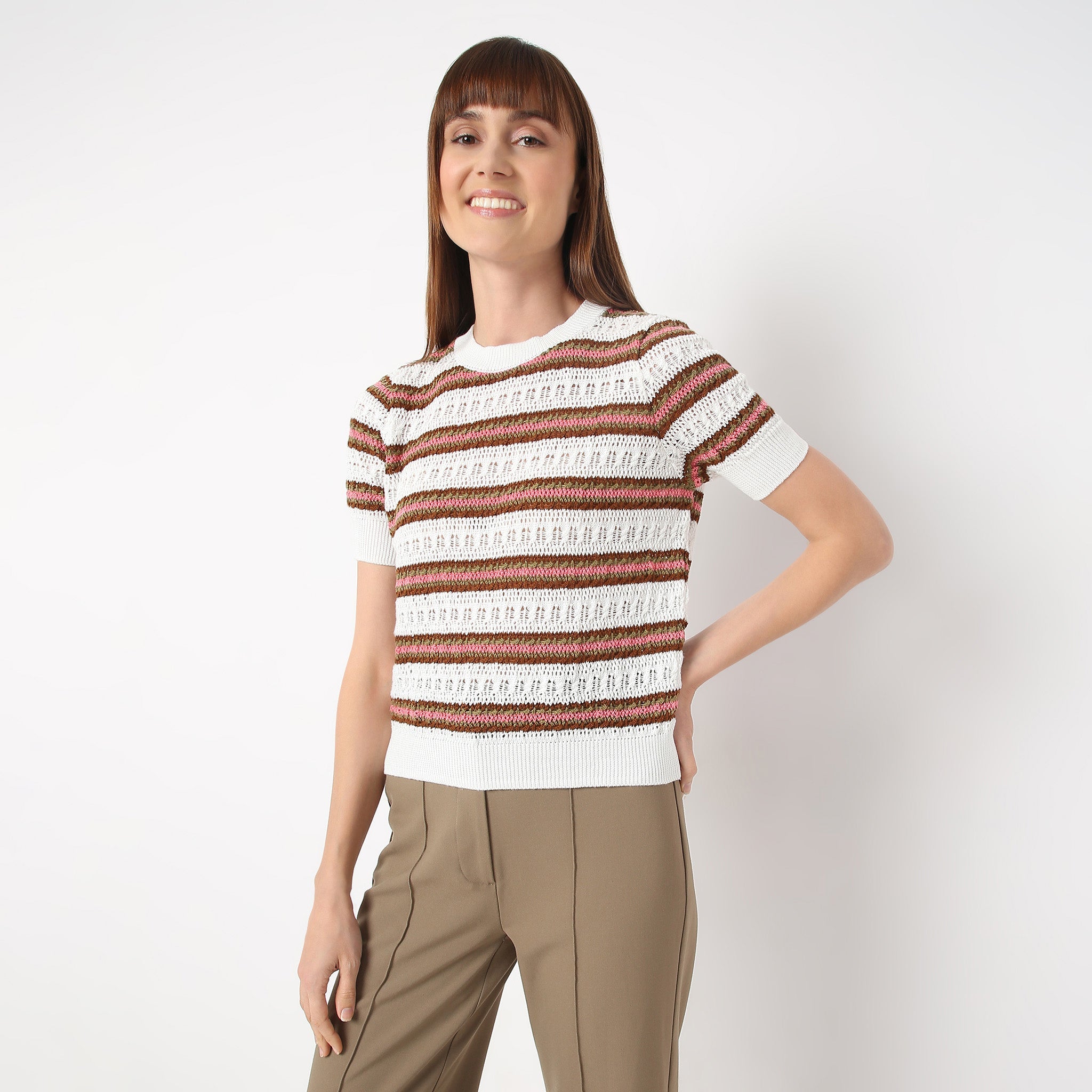 Crew Neck Short Sleeve Kniited Structured Stripped T-Shirt