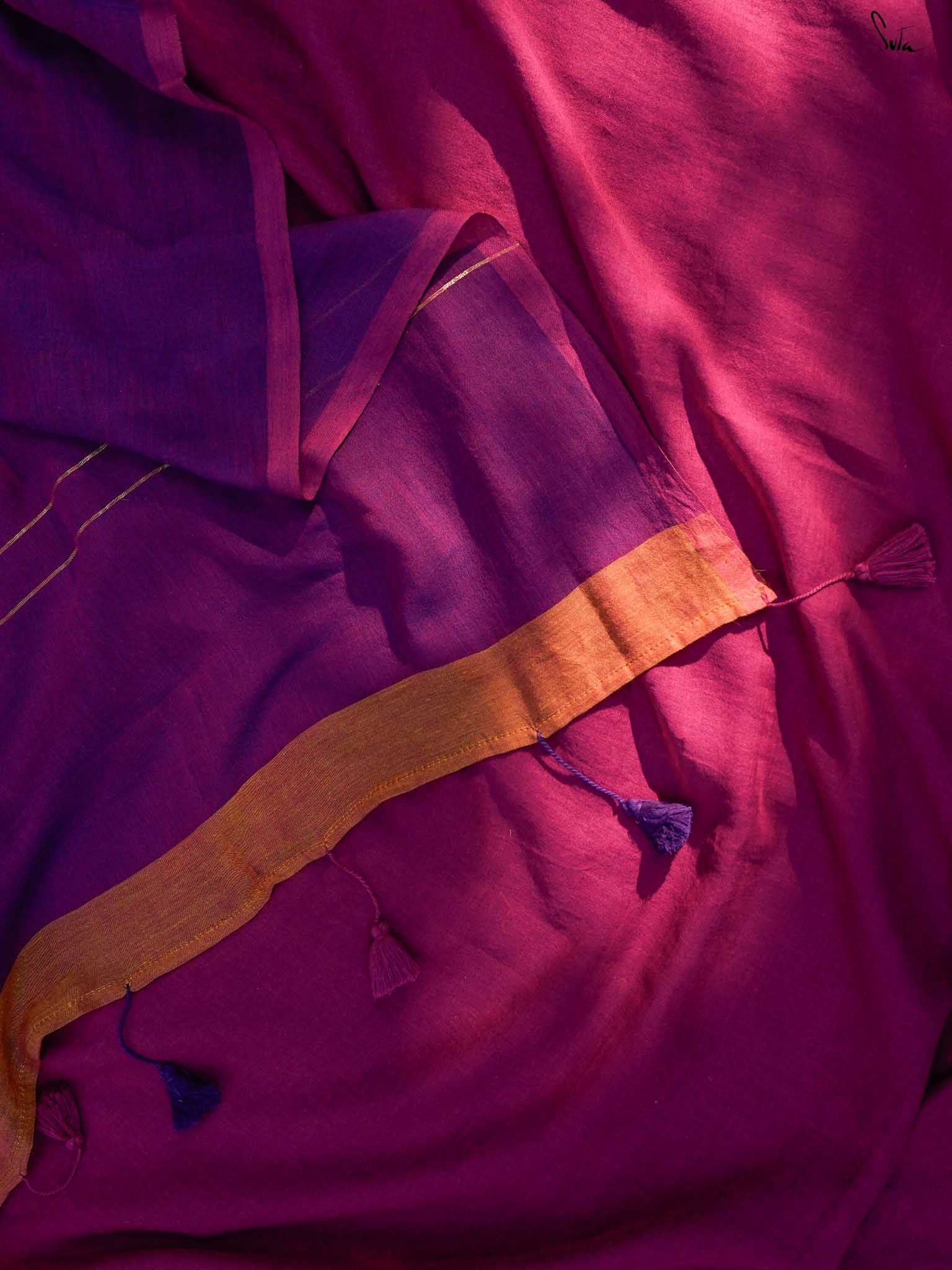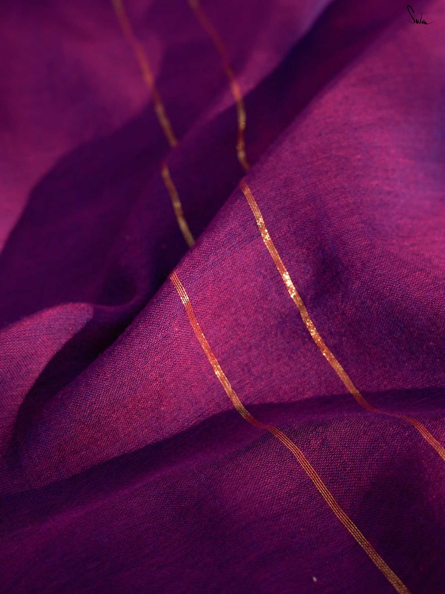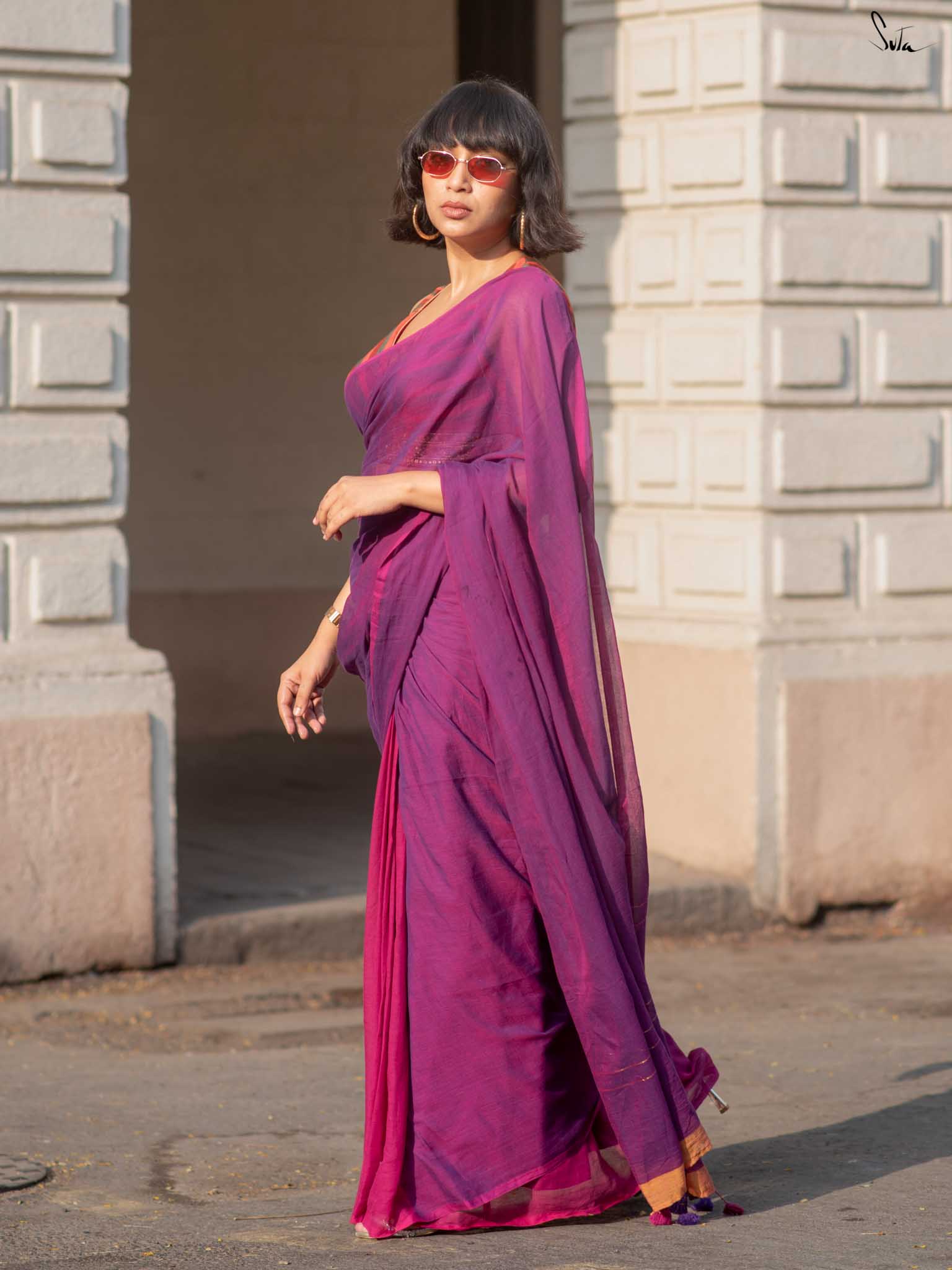 Inspired by the first ray of dawn, Dancing Dhoop makes you dance with joy. This Purple and magenta mul cotton saree brings two bright moods in one soft drape.Woven zari lines grace the pallu, while orange accents add a playful charm to the saree. Pink and purple tassels at the edges bring a touch of cheer. This piece is perfect for breezy brunches and carefree evenings.