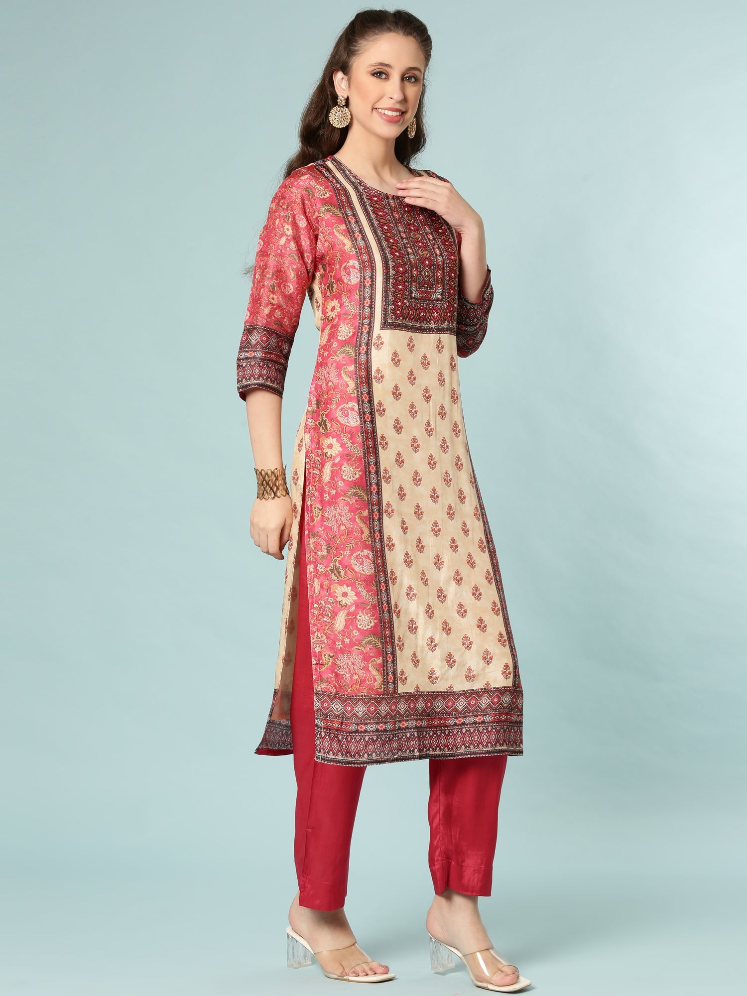 Elevate your wardrobe with this stunning Deep Caramine Dola Silk Printed Three Piece Set. Crafted from luxurious dola silk, this ensemble features exquisite printed detailing that brings sophistication to every occasion. The three-piece design offers versatility, allowing you to mix and match for multiple styling options. Perfect for celebrations, gatherings, or everyday elegance, this set combines traditional craftsmanship with contemporary appeal.