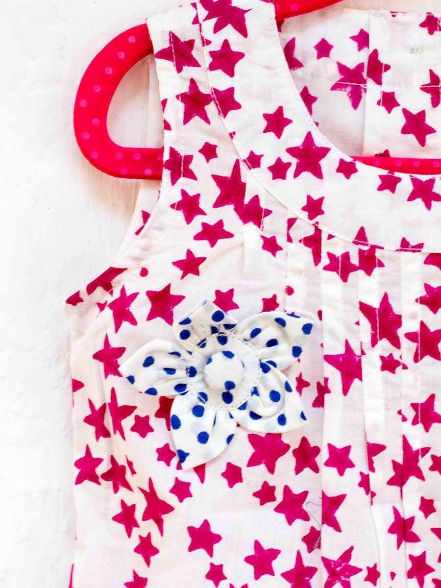 Lovely two layered short dress accented with a floral bow ! Crafted in 100% GOTS Certified Organic Cotton, these hand block print dresses make for a chic addition in your child's wardrobe. The dress has a button hole at the back for easy wearing. Note: While we've classified sizes by age groups, use our Size Chart below to select a best fit.