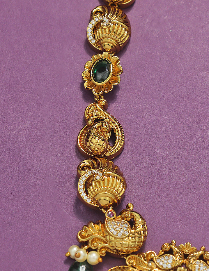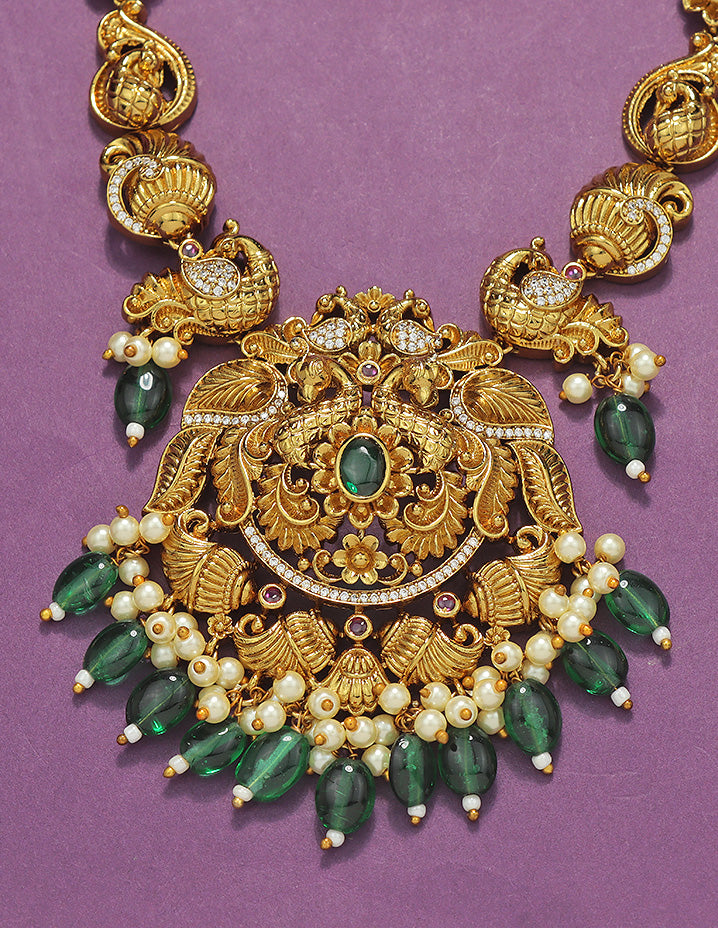 This Matt Polish Kempu Necklace Set, studded with dazzling Emerald and Kempu stones, radiates elegance and style. Its unique design is a visual treat, making it the perfect statement piece for any occasion.