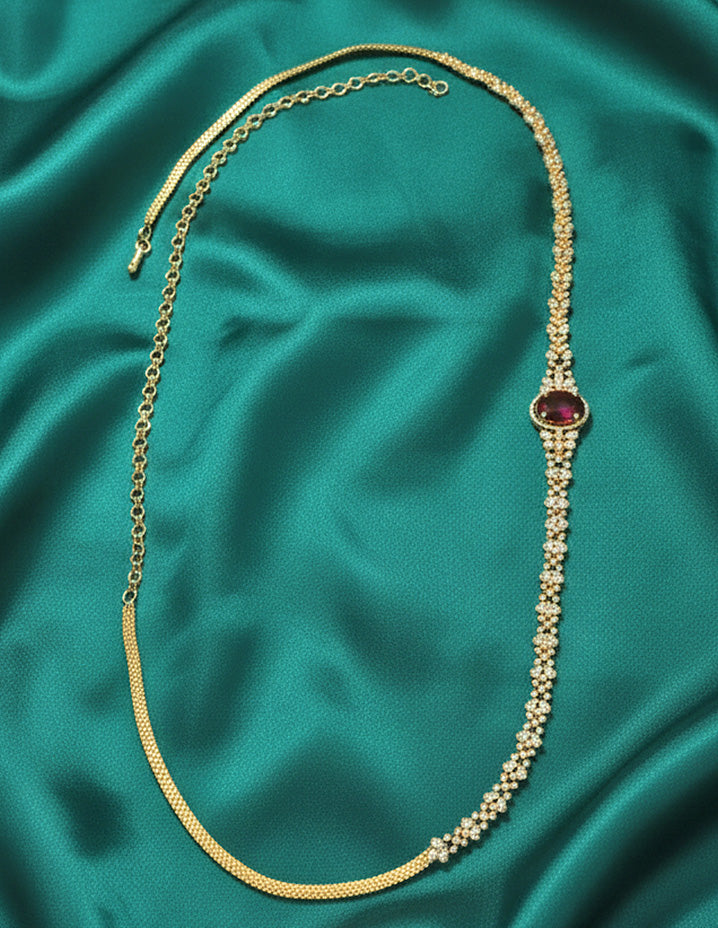 Elevate your traditional attire with this Designer Gold Polish Zirconia Chain Vaddanam, expertly crafted with a blend of gold for enhanced durability and lustrous shine. Adorned with sparkling zirconia stones, this chain vaddanam offers refined elegance and complements various ethnic styles, making it perfect for weddings and special occasions. Its intricate design ensures a comfortable yet secure fit, adding both sophistication and grace to your ensemble.