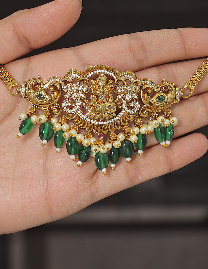 Radiate traditional charm with this antique gold-finish Bajuband, adorned with floral motifs, a striking stone centerpiece, green accents, and elegant with pearl drops—perfect for festive and bridal wear.