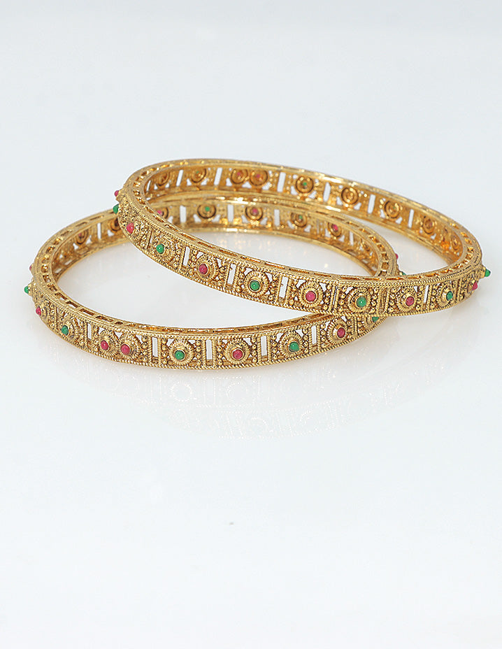 A stunning pair of gold-finish bangles adorned with intricate floral carvings and vibrant red and green stone accents—perfect for festive elegance or timeless tradition.