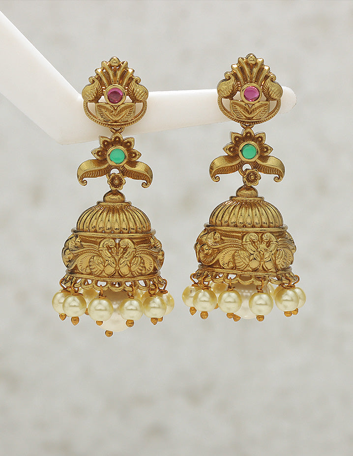 Adorned with intricate temple motifs, vibrant stones, and delicate pearl hangings, these antique gold jhumkas exude traditional charm—perfect for cultural celebrations and bridal elegance.