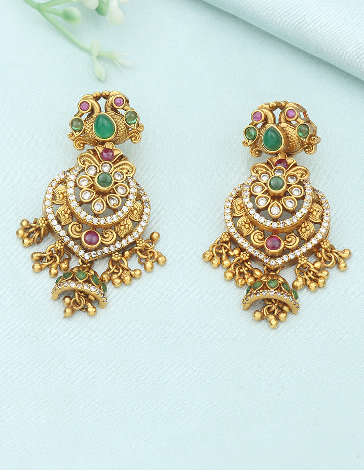 This Zirconia Lakshmi Devi Long Haram Set, featuring dazzling Ruby, Emerald, and White stones with gold balls, radiates elegance and tradition. Perfect for any traditional occasion, it makes a bold, eye-catching statement with its exquisite ethnic craftsmanship.
