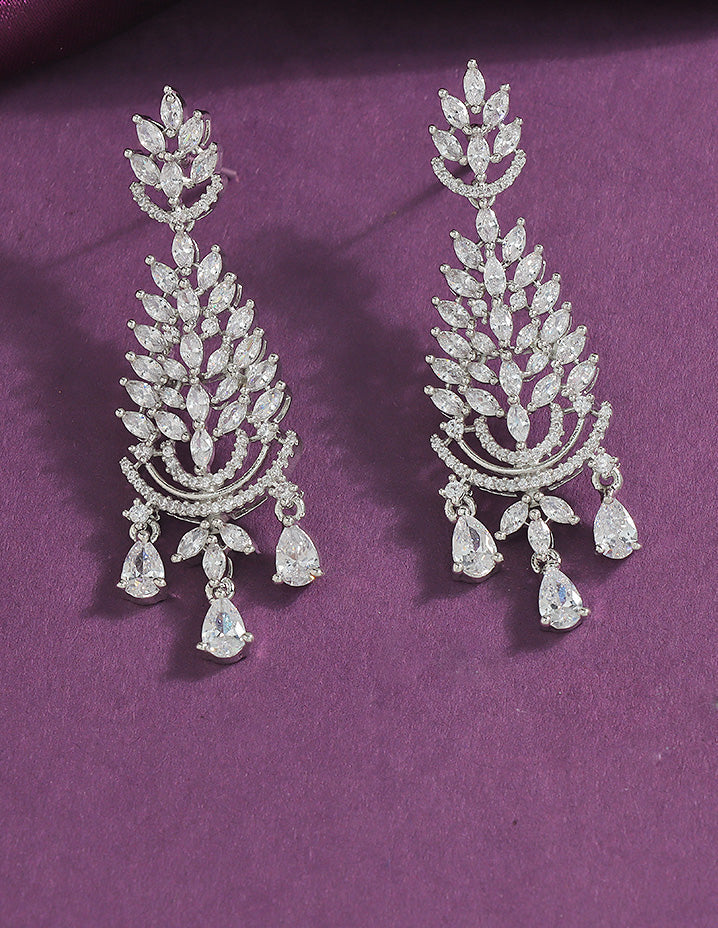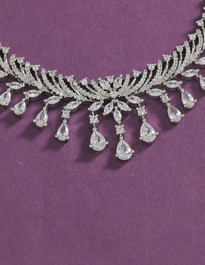A radiant Rhodium-toned necklace and earring set adorned with sparkling Bud and floral motifs, perfectly blending elegance and charm for your special occasions.