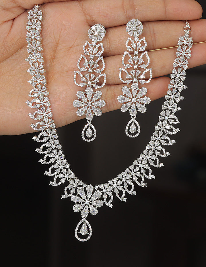 A radiant silver-toned necklace and earring set adorned with sparkling Bud and floral motifs, perfectly blending elegance and charm for your special occasions.