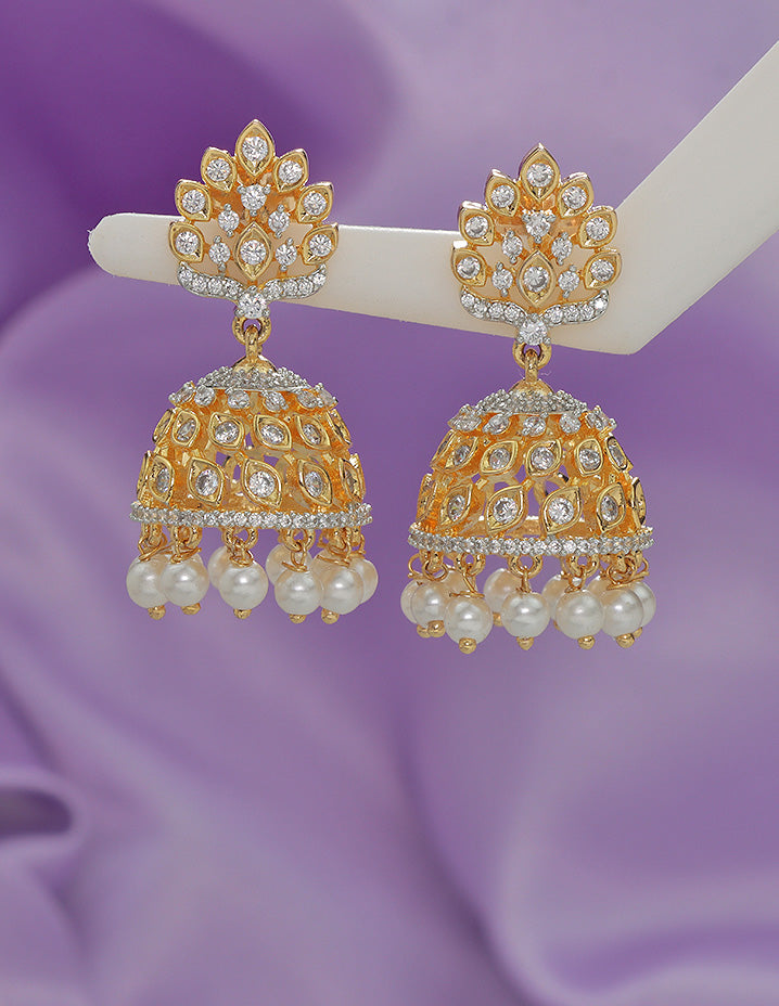 Designer earrings are classic jhumka-style danglers with a fusion of traditional and contemporary design. The bell-shaped drop is richly embellished with white stones and tear-drop dangles, paired with a sparkling oval top.