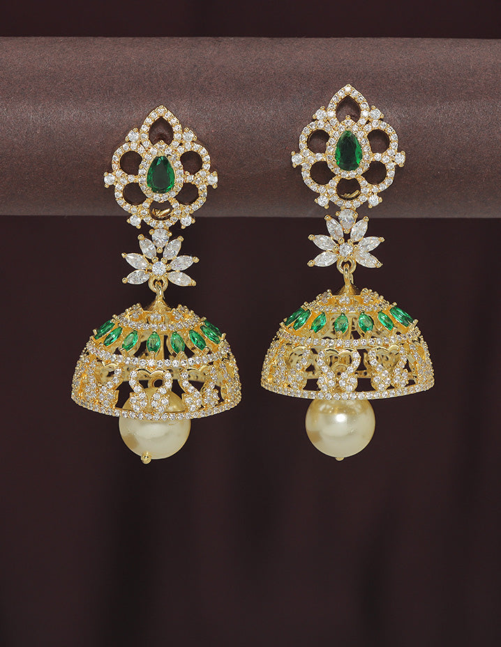 Shine bright with these gold-plated jhumkas, studded with emerald and white American diamonds. A bold fusion of elegance and tradition — perfect for any occasion!