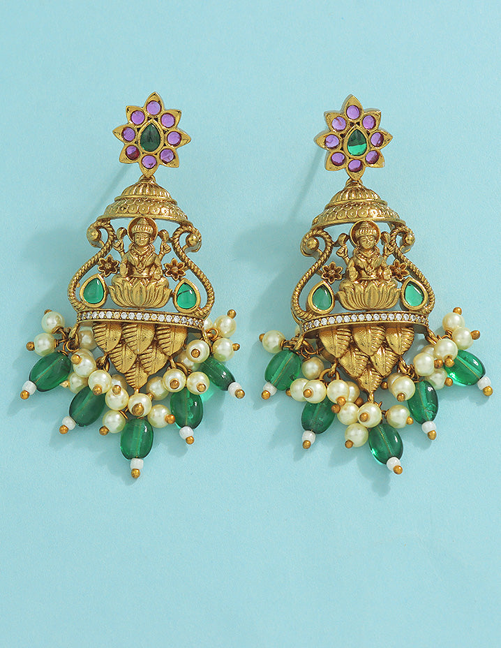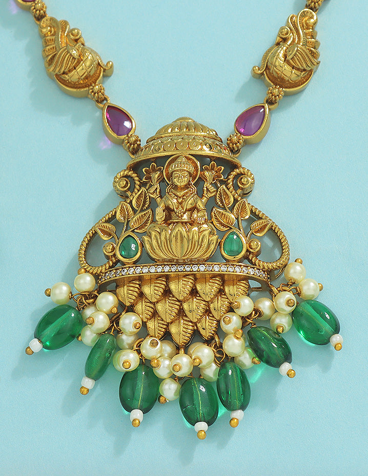 A majestic gold-plated necklace set adorned with vibrant magenta beads, emerald and ruby accents, and intricate temple motifs. The divine Lakshmi design and rich detailing exude traditional charm, perfect for bridal and festive elegance.