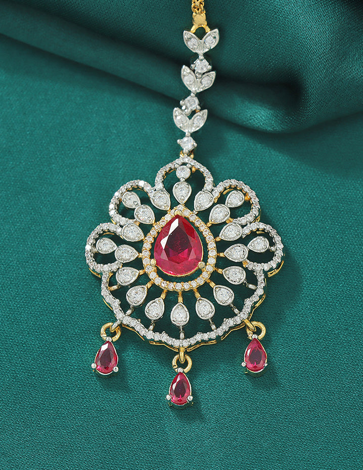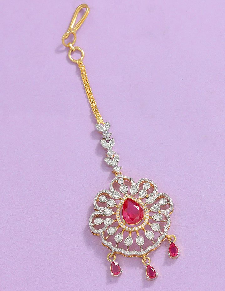 A dazzling maang tikka adorned with a bold rani pink teardrop centerpiece, surrounded by intricate patterns of CZ stones arranged like radiant petals. Finished with dangling ruby drops for an added touch of elegance and grace — perfect for bridal or festive looks.