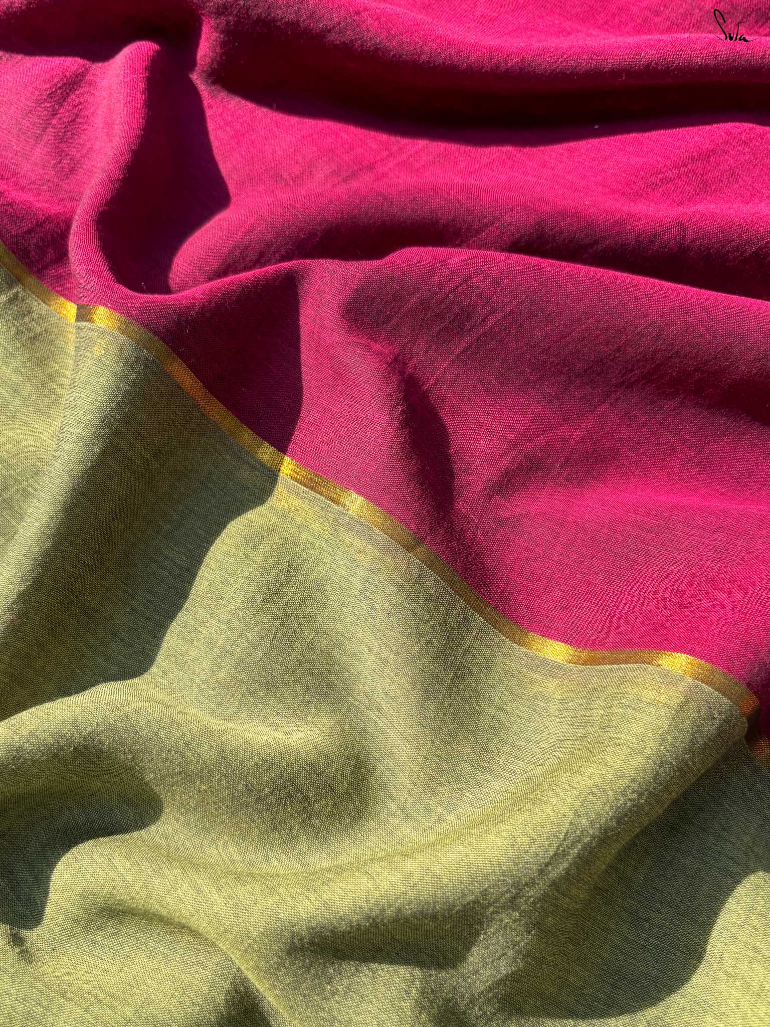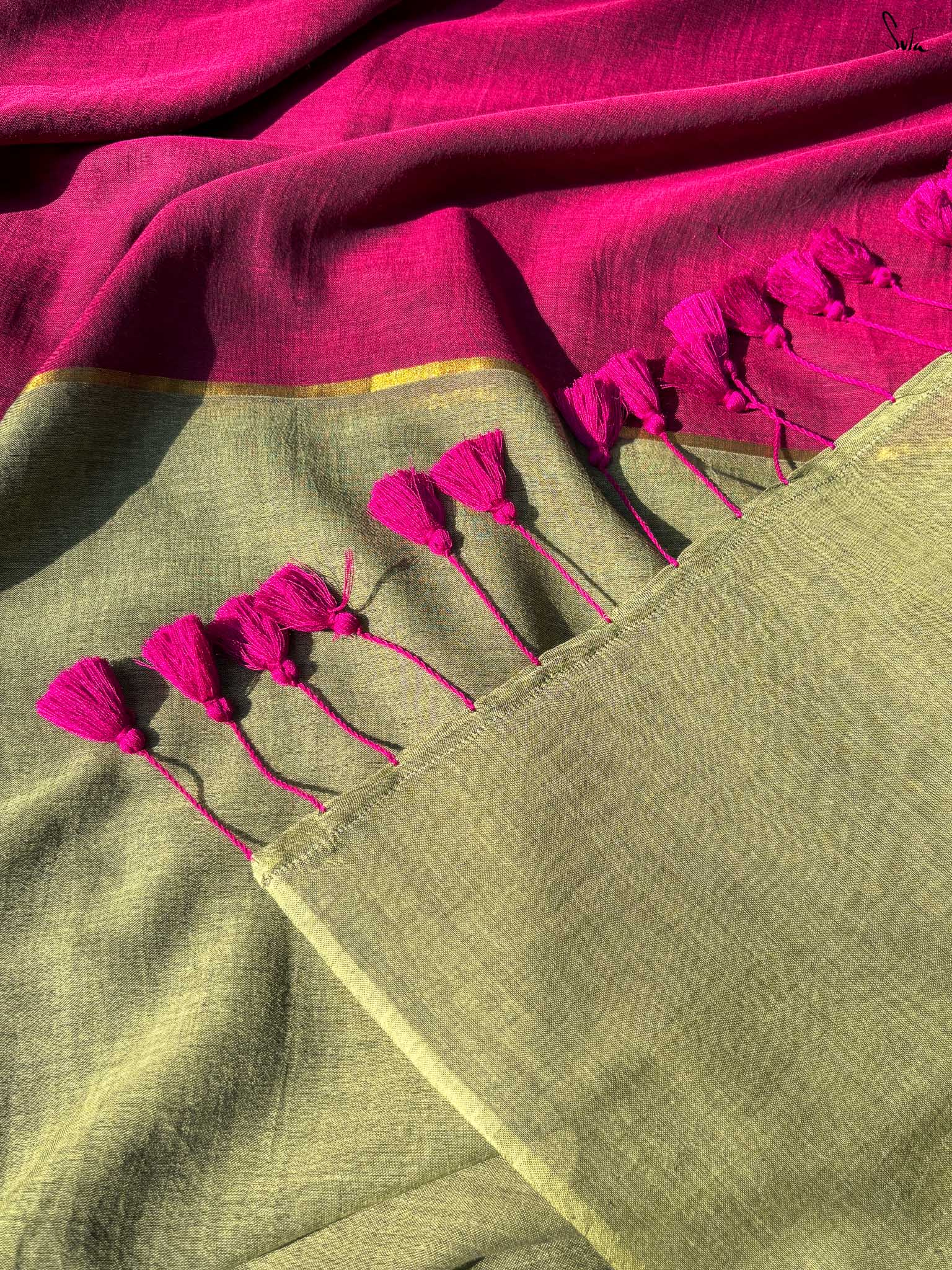 Celebrate vibrant contrasts with Dipped in Gulaab, a mul cotton saree that brings together pink and green in a striking half-and-half design. The center is highlighted with a delicate zari stripe, adding a subtle shimmer that enhances the elegance of the drape. Woven with care, this saree combines artisanal craftsmanship with everyday comfort, making it perfect for festive occasions or wedding celebrations.