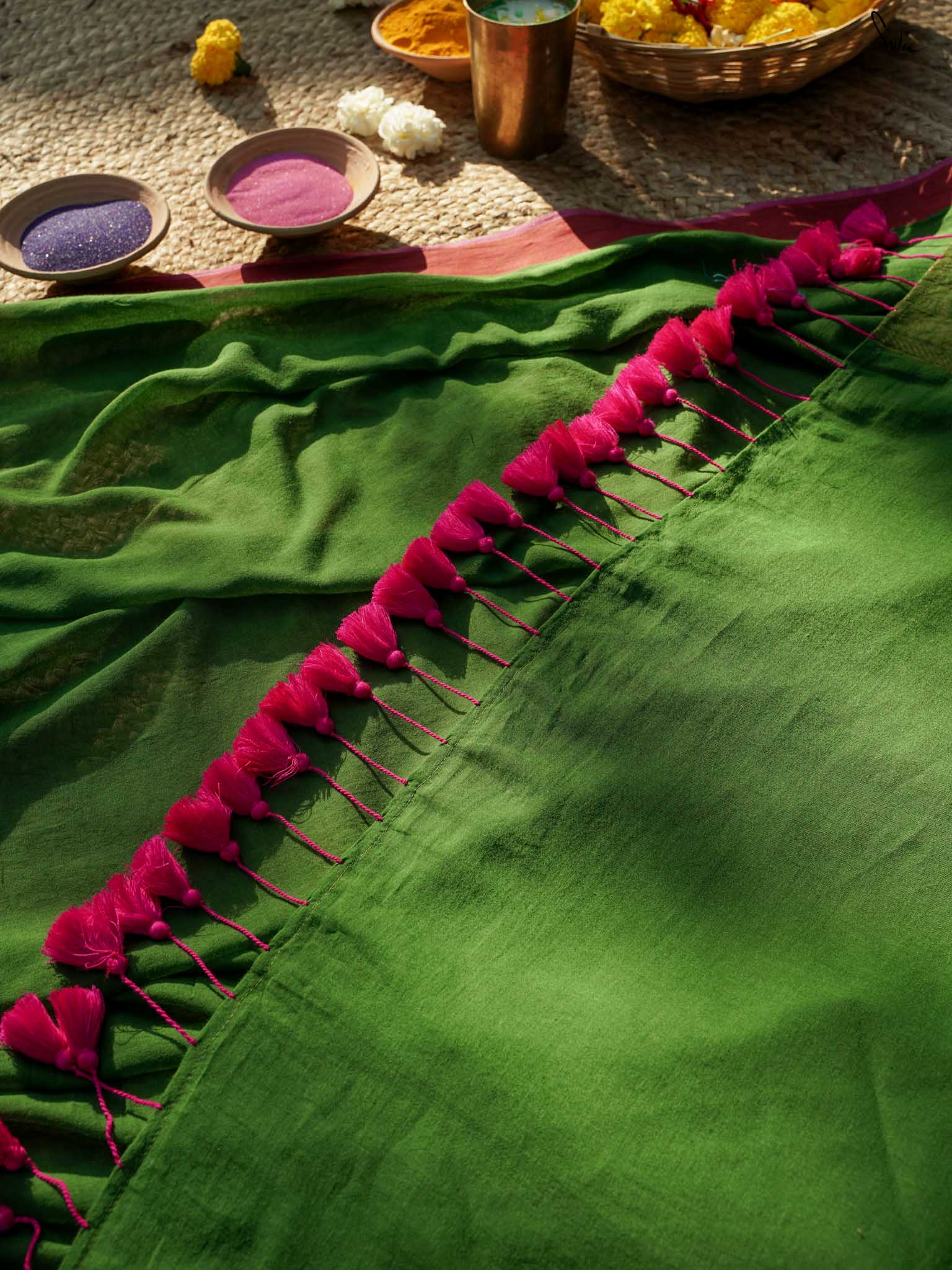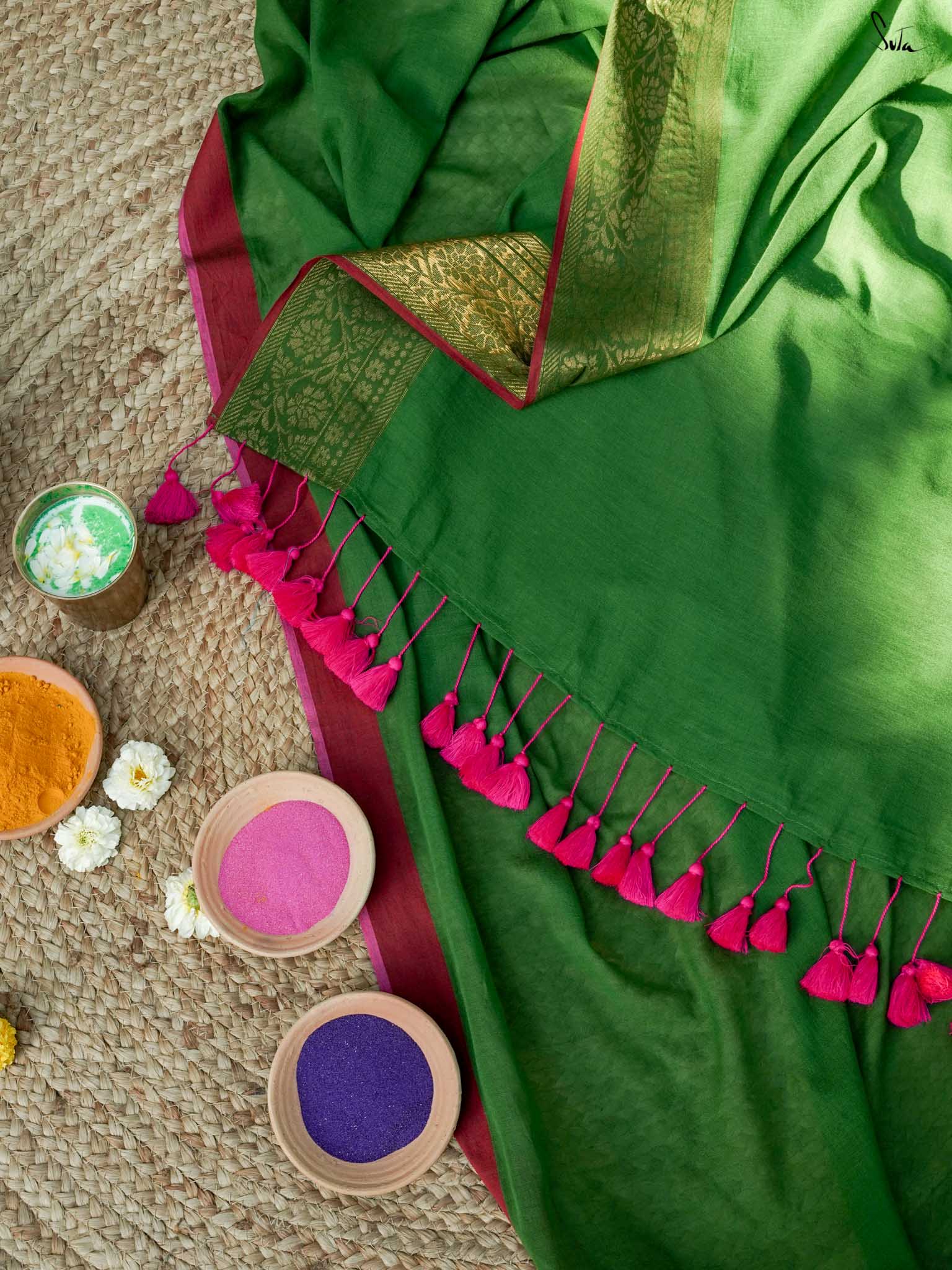 Deep, rich, and full of soul, this olive green mul cotton saree is a tribute to the timeless beauty of henna, the intricate art that decorates the hands of every Holi celebrant. The jacquard weave and zari-woven contrast border bring a subtle elegance, while the shimmering tassels capture the magic of the festival. This saree speaks of connections, of traditions passed through generations, and of the deep beauty found in every celebration.