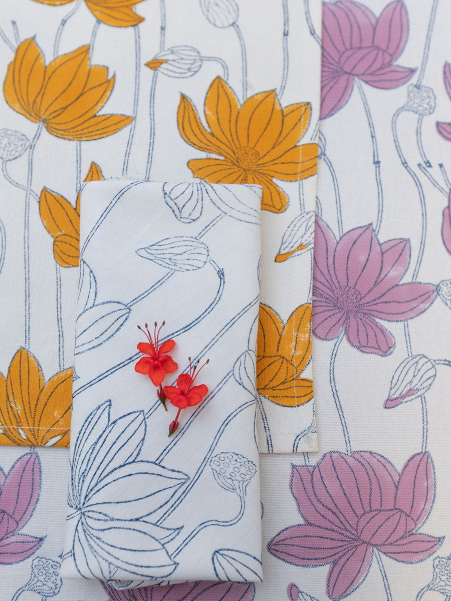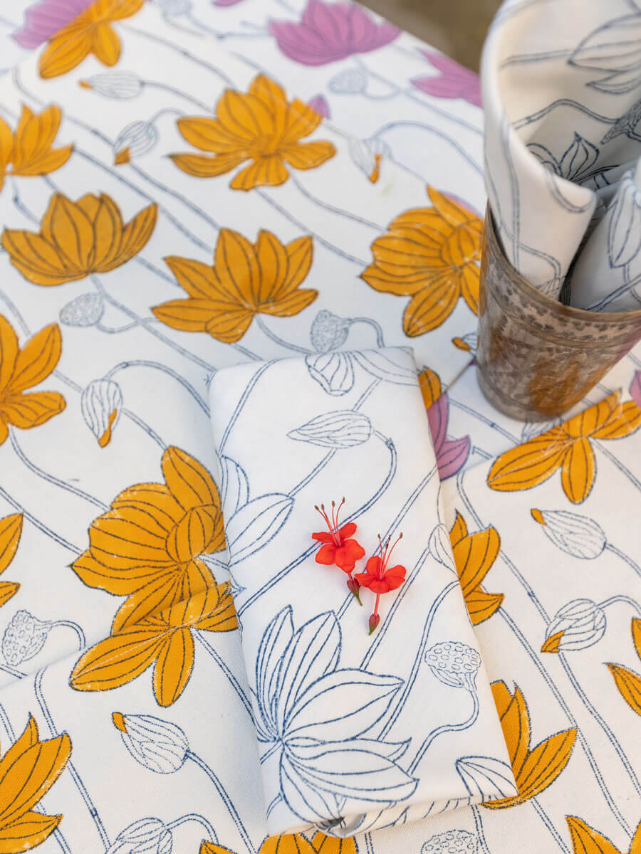 Padma or the Lotus is a central figure in many art forms including Pichhwai. It's a flower with meaning, beauty, and great cultural significance. The origin of the Lotus in Hindu mythology goes as far back as 'Samudra Manthan'. Its first association is with Lakshmi who also emerges from 'Samudra', hence, is referred to as Padmaja or Padmavati. This hand block printed home textiles collection is inspired by the beautiful lotus and other nature inspired elements.