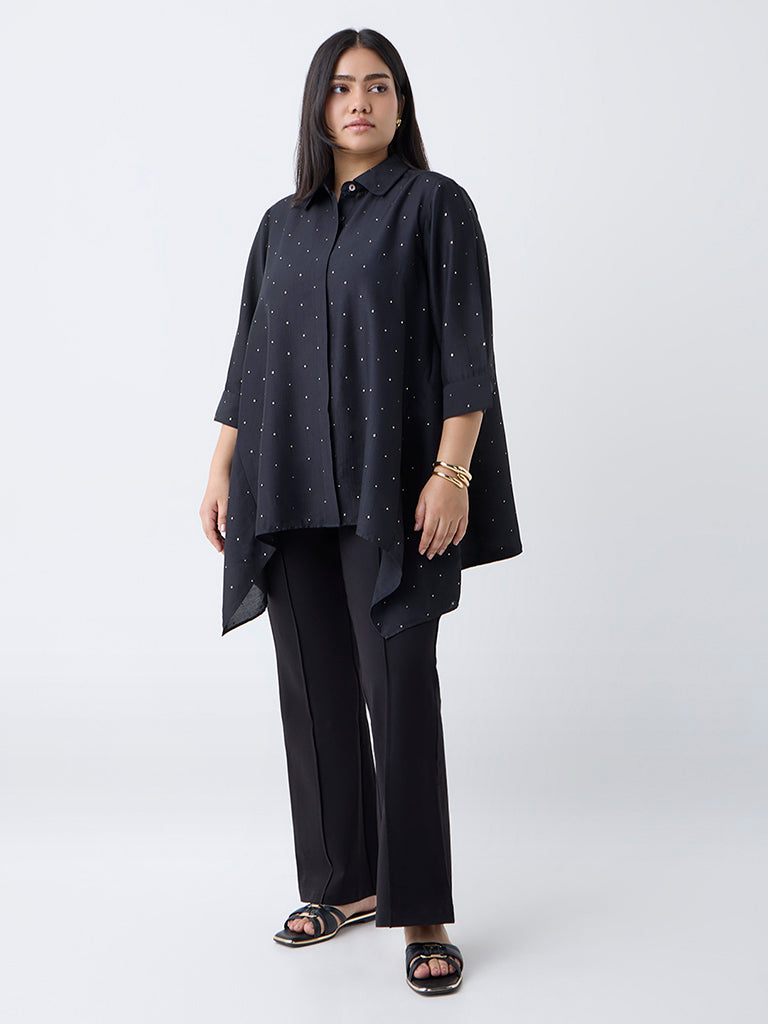 Make every occasion feel special in this black Diza tunic adorned with delicate embellishments. The structured collar and concealed placket keep the look refined, while the three-quarter sleeves and asymmetric hemline offer a shape that moves comfortably with you.