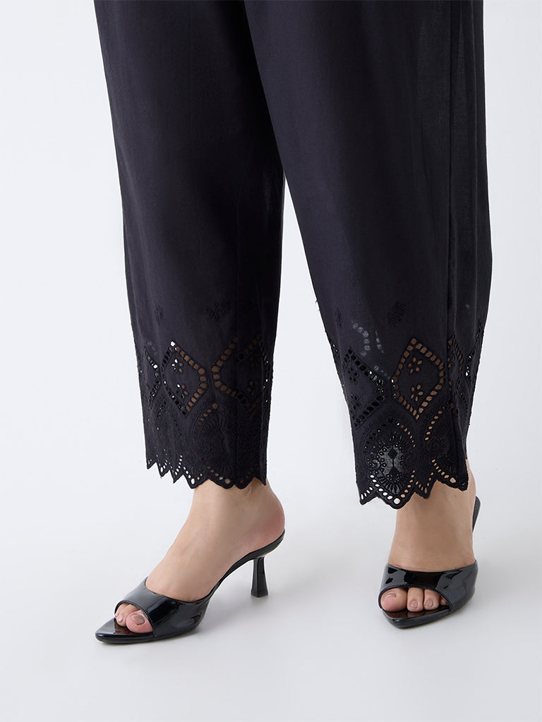 Diza Black Schiffli Detailed Cotton Pants