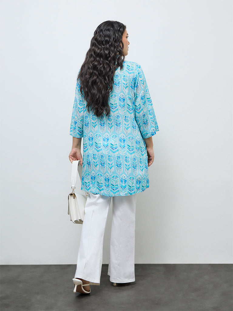 Diza presents this blue tunic featuring botanical prints that bring a fusion appeal to everyday ethnic wear. It is milled from a soft, lightweight fabric for a comfortable feel through the day. A structured collar, a concealed button-up front and three-quarter sleeves keeps the overall silhouette clean and balanced.
