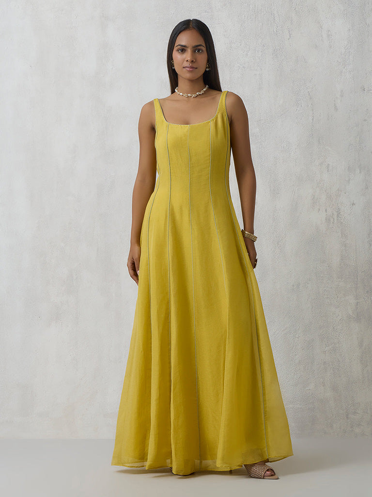 Striking a perfect balance of modern elegance and festive flair, this two-piece set pairs a flowing yellow maxi dress with a statement longline jacket. The sleeveless dress is tailored in a fluid silhouette with a soft sheen that moves gracefully with every step. Layered over it, the aqua brocade jacket shimmers with intricate woven motifs, finished with a clean round neckline and three-quarter sleeves.