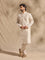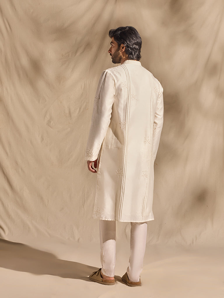 This white kurta brings a sense of quiet elegance to your festive repertoire. Crafted from a lightweight fabric, it is detailed with delicate tonal embellishment and fine pintuck accents that lend subtle depth. The band collar and concealed placket keep the look understated, while full sleeves and an elongated silhouette complete the design with timeless appeal.