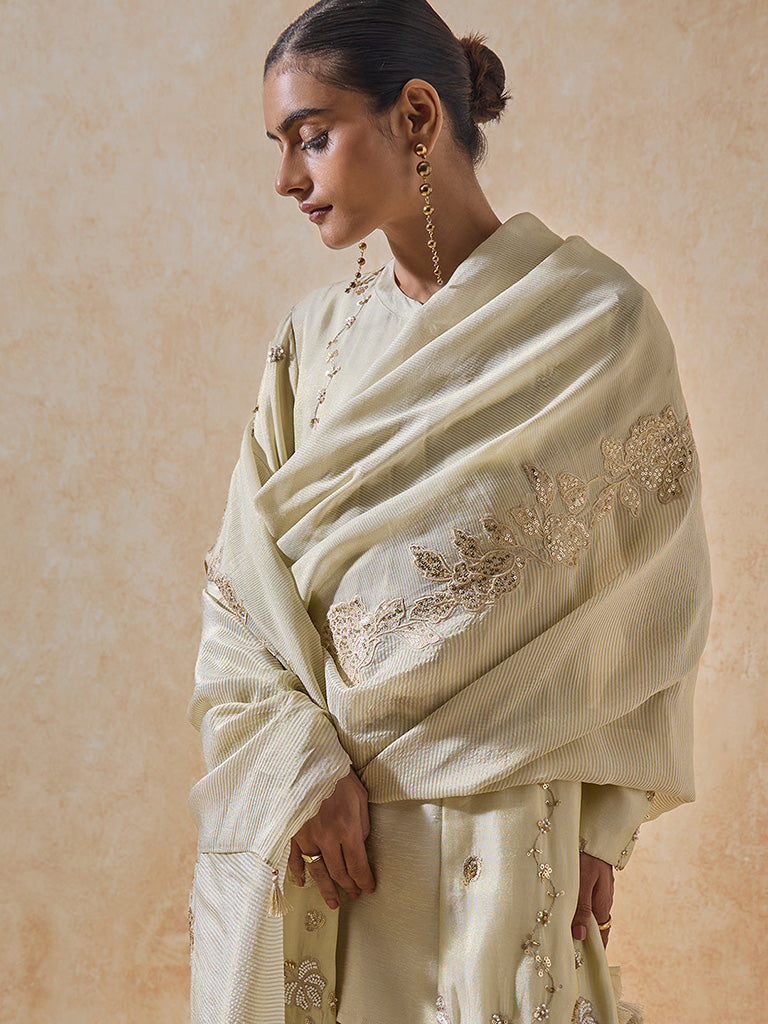 This off-white dupatta is a timeless addition to festive wardrobes. Detailed with delicate embroidery and scattered sequin work, it catches the light with understated sparkle. Lightweight and versatile, it pairs seamlessly with kurtas, suits, and contemporary festive ensembles, adding a refined finish to every look.