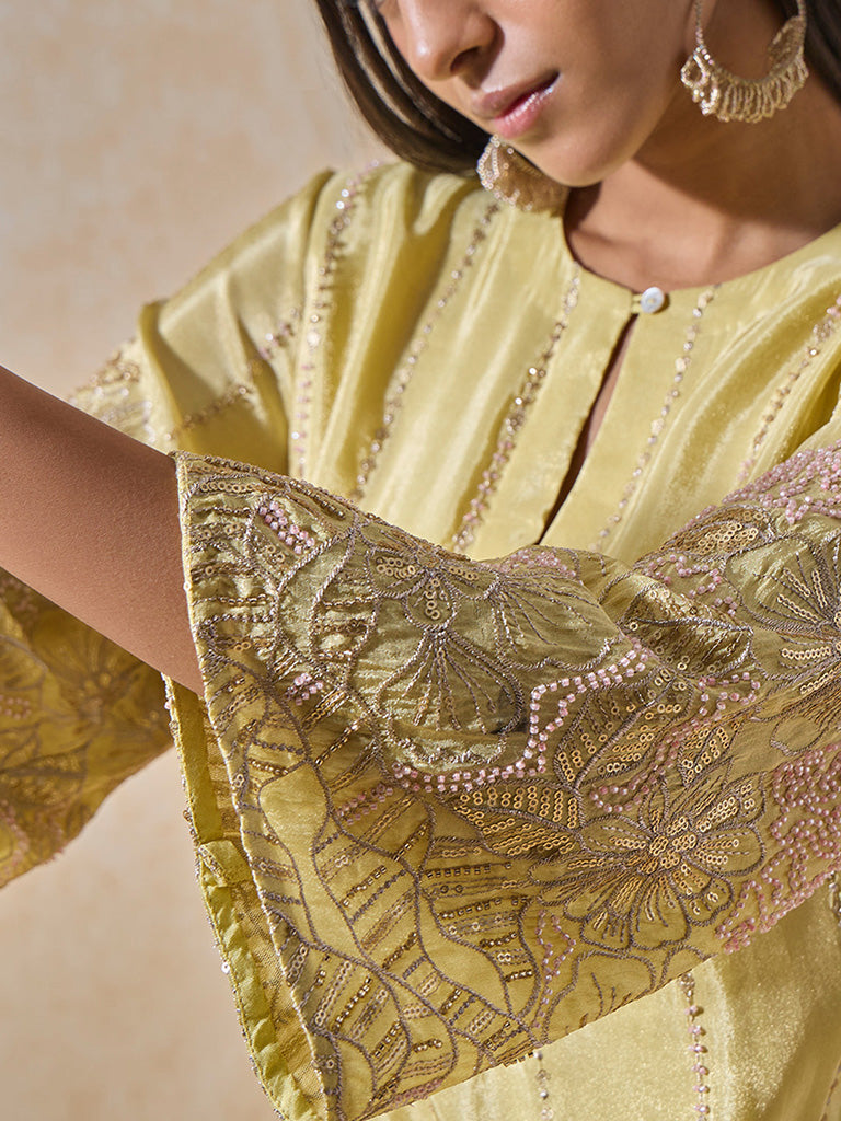 This yellow kurti is designed to bring festive polish in the most effortless way. The fabric shimmers softly, decorated with sequinned accents that add quiet glamour. Floral embroidery along the flared sleeves and hem creates texture and intricacy, making it a versatile choice for evening gatherings.
