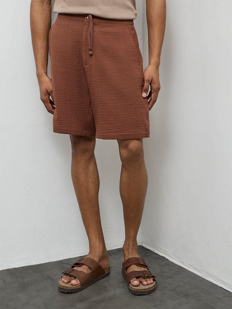 ETA Brown Crinkle-Textured Relaxed-Fit Mid-Rise Cotton Shorts