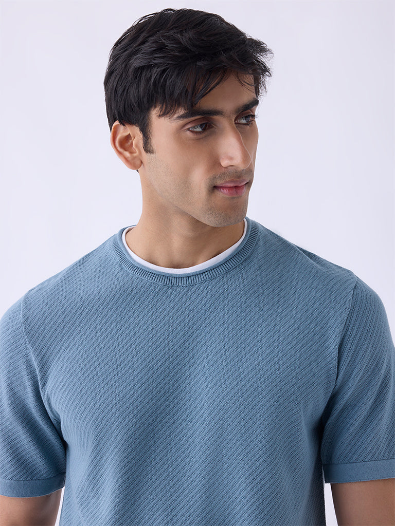 ETA Dusty Blue Woven-Textured Relaxed-Fit Cotton T-Shirt