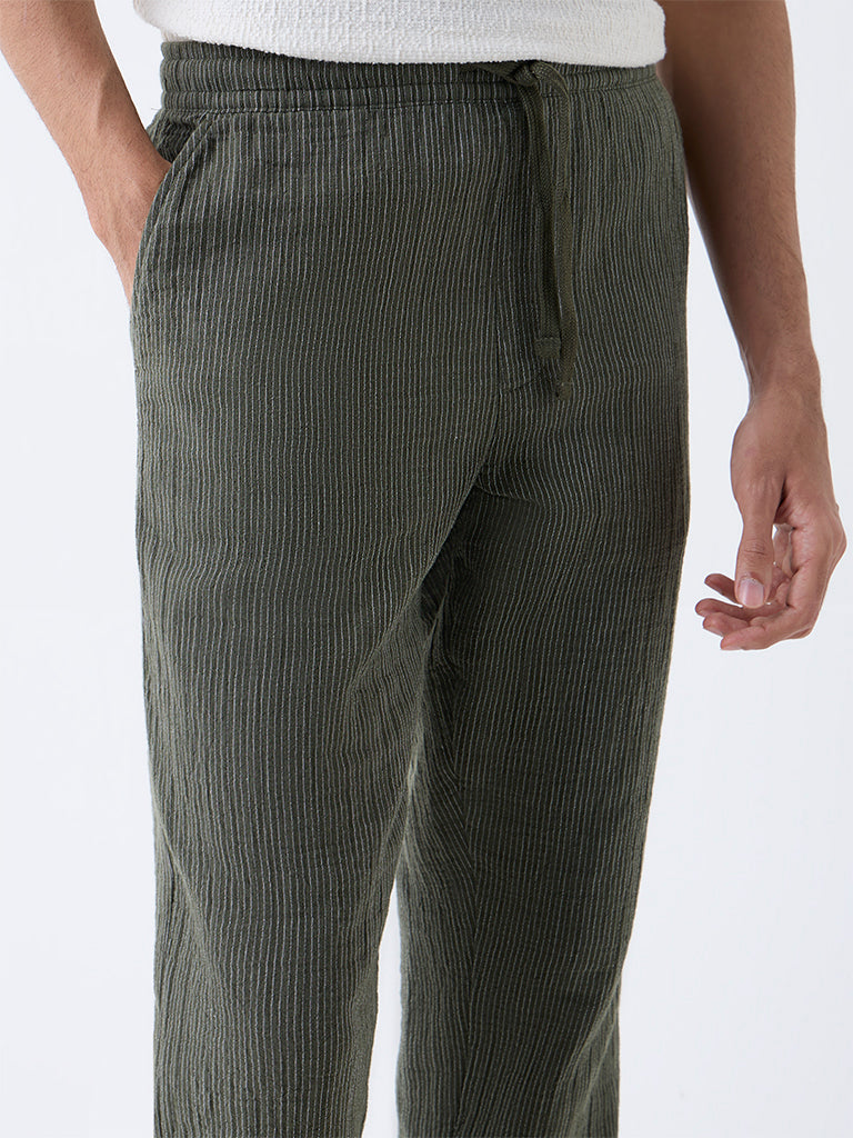 These olive pinstriped cotton pants from ETA combine laid-back comfort with subtle sophistication. Designed in a relaxed mid-rise silhouette, they feature a smooth elastic waistband with adjustable drawstrings and multiple pockets—perfect for effortless, everyday wear.
