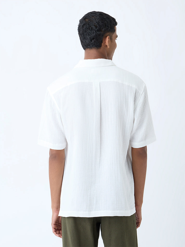 Bring breezy sophistication to your summer wardrobe with this white shirt from ETA. Showcasing floral and paisley embroidery on a crinkle-textured fabric, it is tailored in a relaxed silhouette for effortless ease. Styled with a camp collar, button placket, and short sleeves, this versatile piece merges contemporary design with casual comfort.