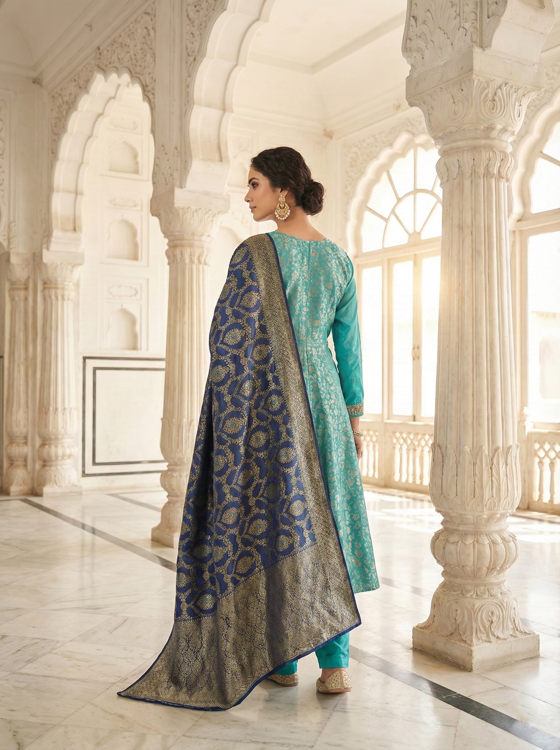 Elevate your ethnic wardrobe with this stunning Ferozi Banarasi Zari Floral Embroidery Three Piece Set. Crafted with traditional Banarasi weaving techniques, this ensemble features intricate zari work and delicate floral embroidery in a captivating ferozi shade. The three-piece set offers versatility for weddings, festivals, and special occasions. Rich in heritage and contemporary in appeal, each piece showcases meticulous craftsmanship that celebrates timeless Indian artistry. Perfect for those who appreciate authentic traditional wear with refined elegance.