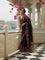 This black saree is crafted from viscose organza fabric with intricate embroidery, depicting soothing scenes of cherry blossom trees and birds. The tiny red flower buttis dancing all over the saree is the optimal final touch.