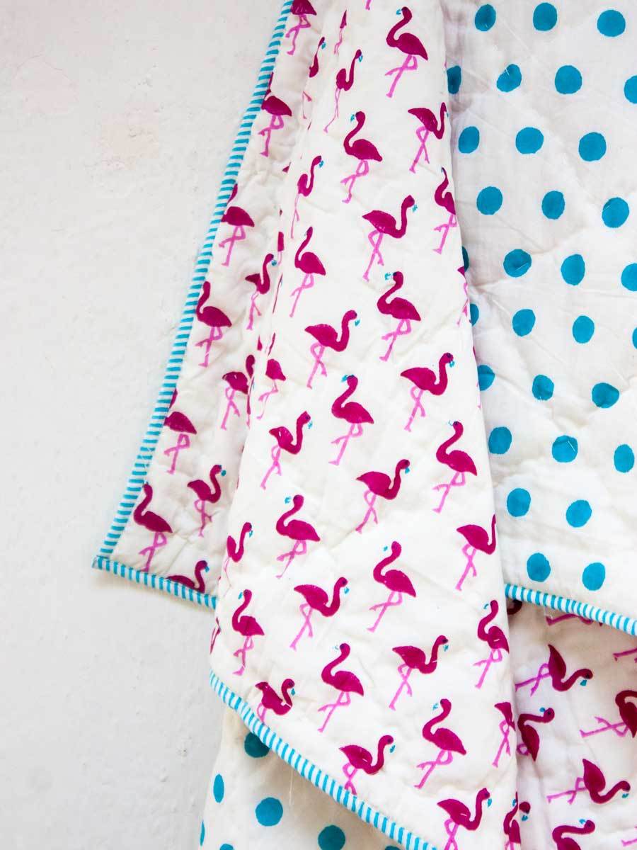 100% GOTS certified organic cotton; hand block printed; fine hand quilted; complementing prints on both sides