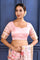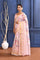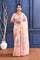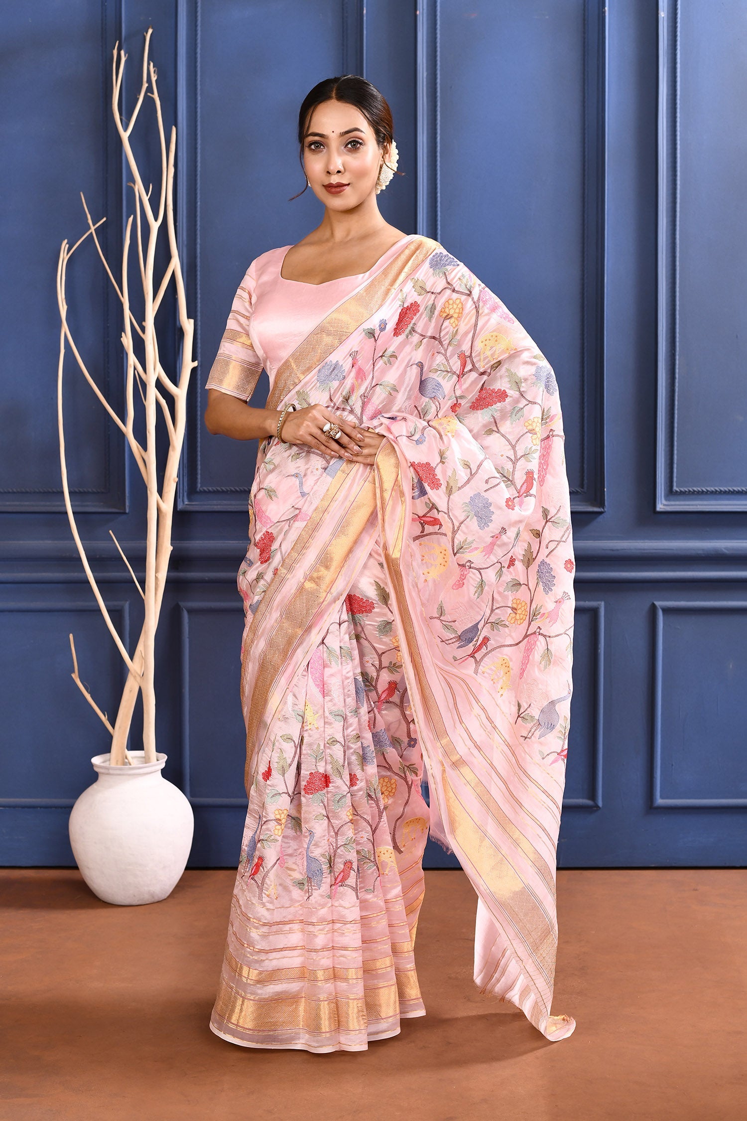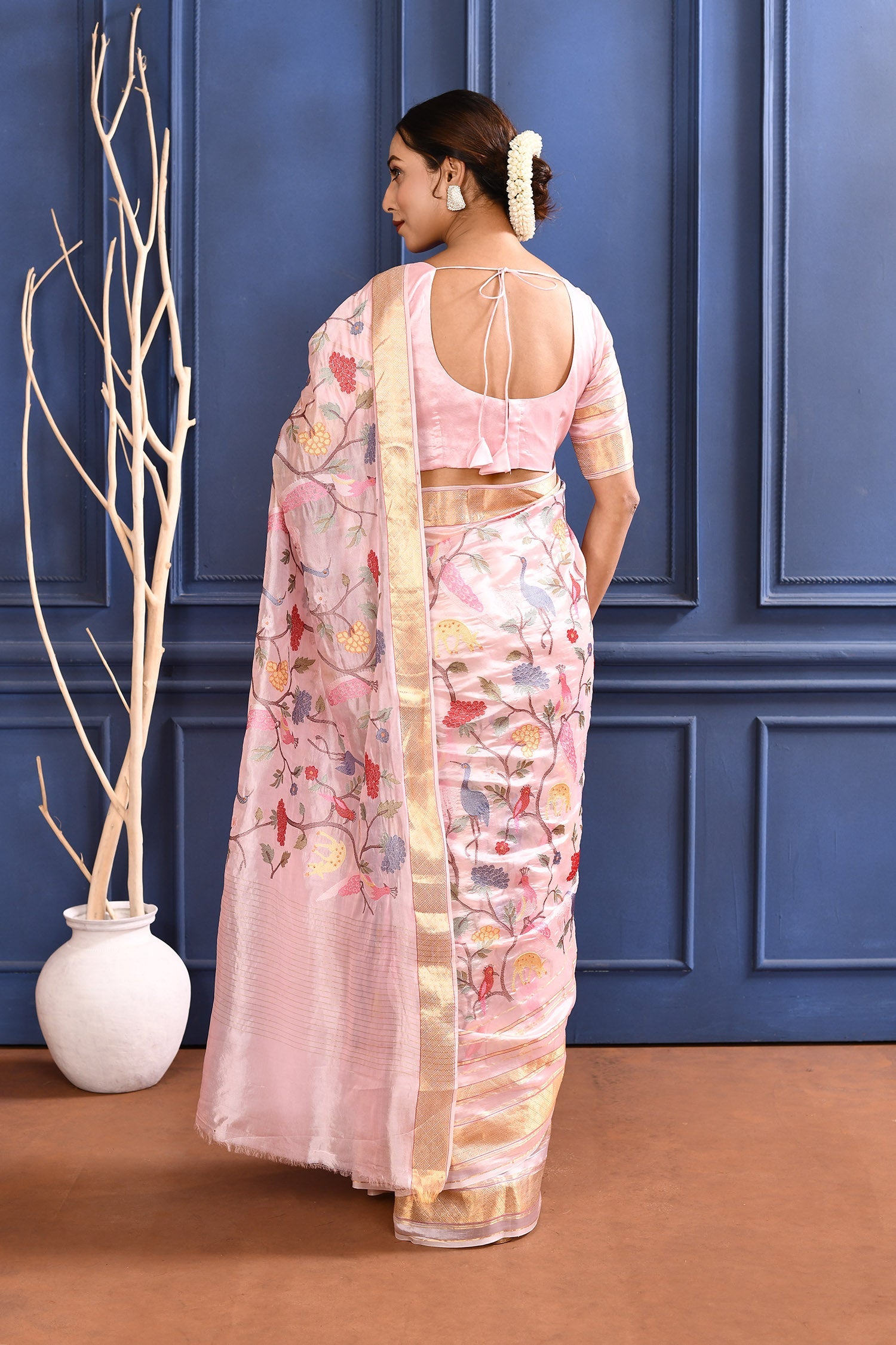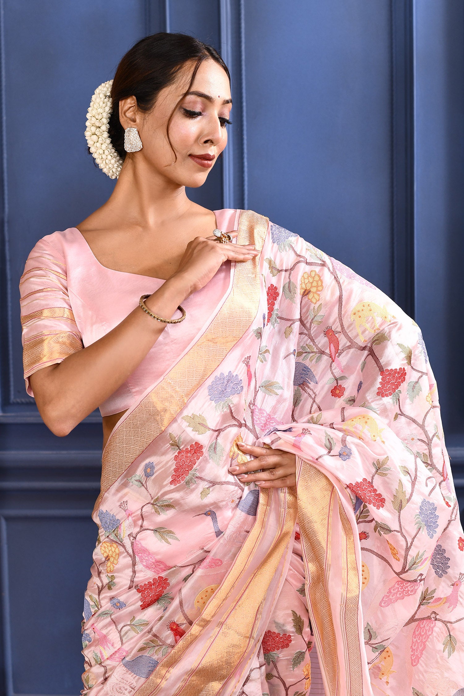 The flamingo pink silk saree with floral and bird embroidery and woven zari border along with matching blouse for a graceful traditional look.