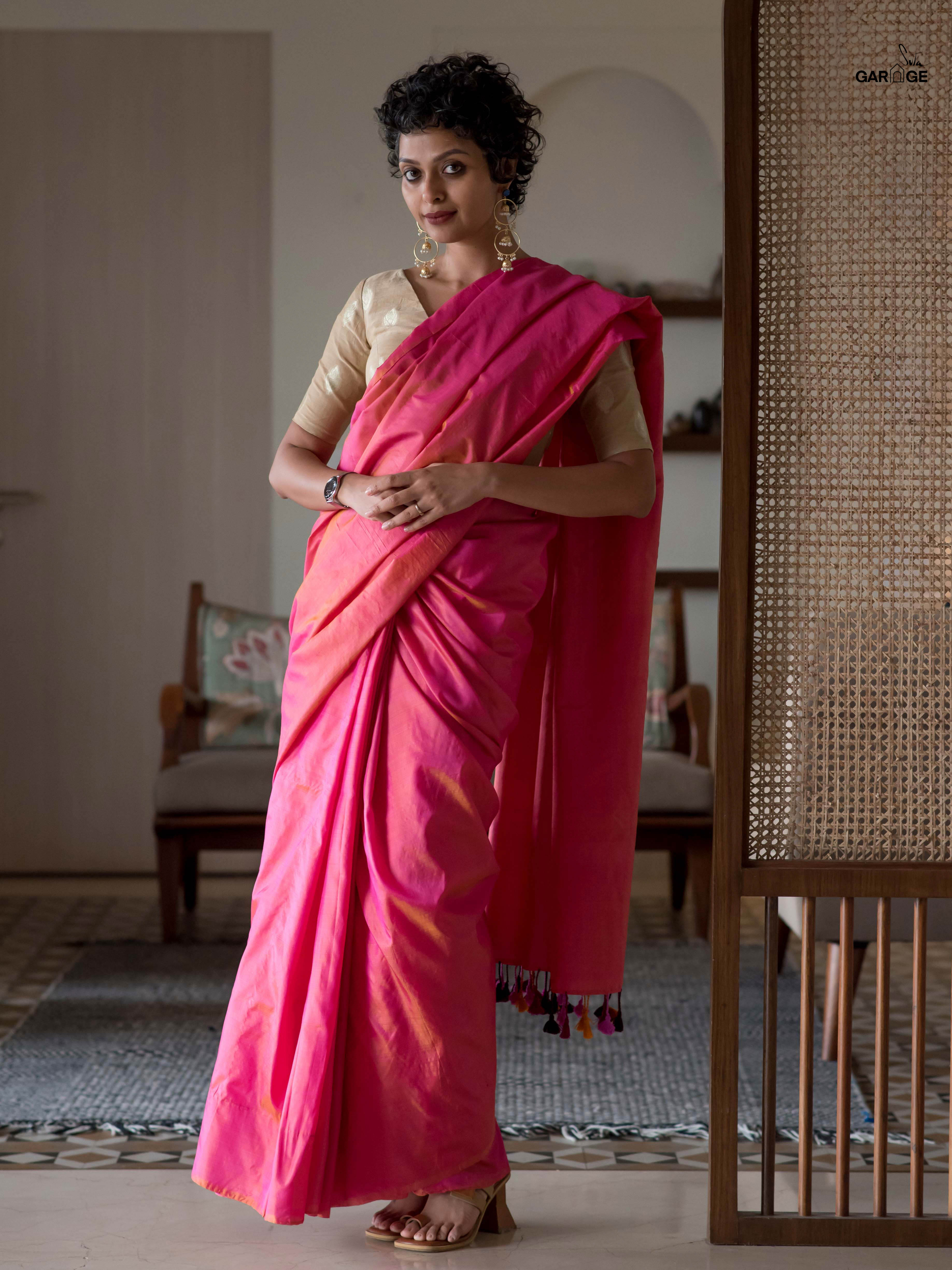 Silk is a natural fibre produced by the cocoons of silkworms. The shimmering appearance of silk is attributed to the prism-like structure of its fibres. While being smooth and soft, pure silk is also extremely durable and not slippery. Pure silk has been used in this rich red saree, to create a piece that is truly special and memorable.