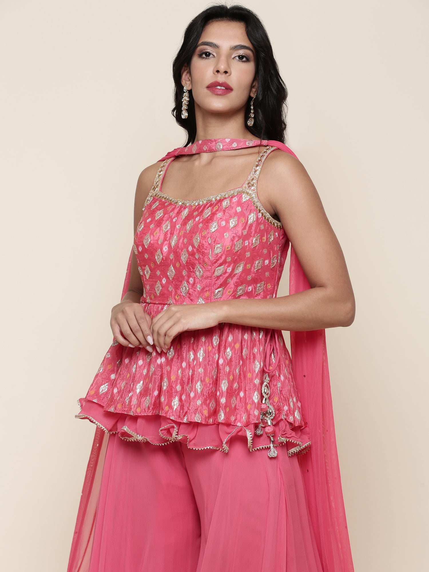 Elevate your wardrobe with the Ghajari georgette peplum and palazzo three-piece set. Crafted from lightweight georgette fabric, this ensemble combines comfort with elegance, featuring a flattering peplum top paired with stylish palazzo pants and a matching dupatta. Perfect for festive occasions or casual gatherings, it offers a graceful silhouette that ensures you stand out effortlessly. Embrace sophistication and ease in one stunning set.