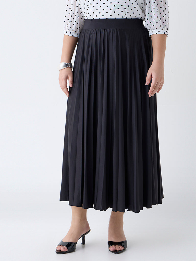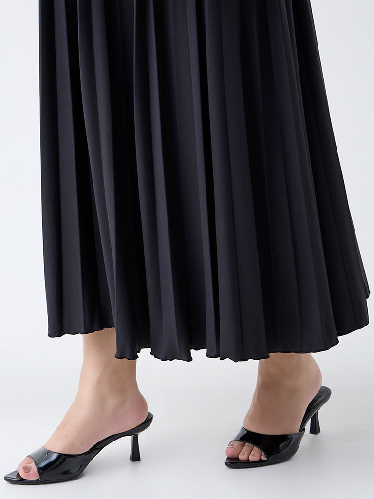 This black high-rise skirt from Gia features elegant accordion pleats that create a graceful flow with every movement. Made from a breathable fabric, it offers a comfortable fit enhanced by a smooth elastic waistband.