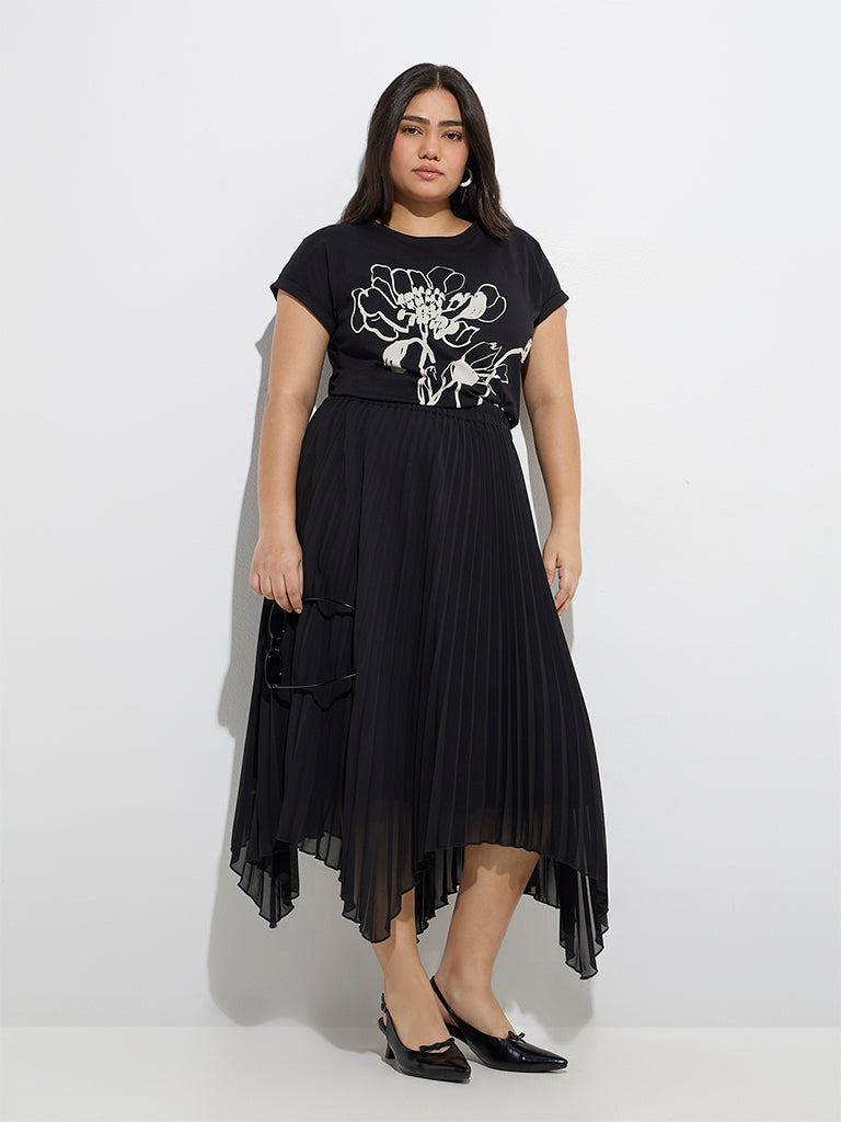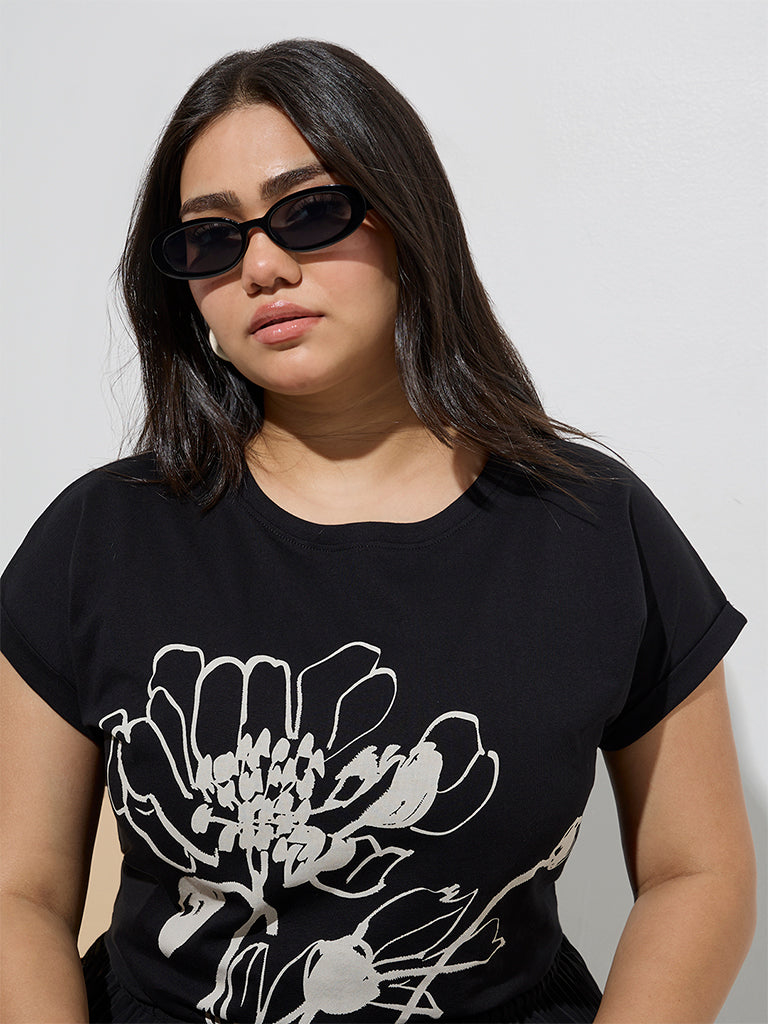 This black t-shirt from Gia brings a subtle twist to everyday dressing with its understated floral print. Spun from pure cotton for all-day ease, it features a classic round neck and upturned dolman sleeves that add a thoughtful finish.