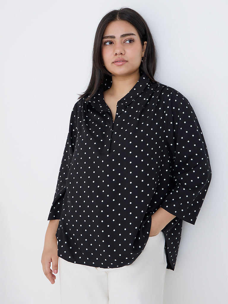 Gia introduces this black shirt patterned with polka dot motifs. Crafted from a breathable fabric, it features a clean collar and a neat quarter button placket finished with a concealed closure for a smooth, polished look. Three-quarter sleeves offer an effortlessly balanced silhouette—perfect for work, weekends, or anywhere in between.