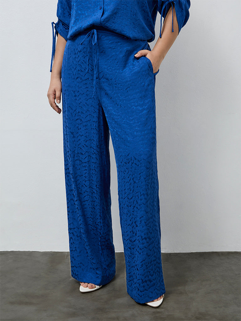 A statement addition to your wardrobe, this blue pants from Gia exhibits a self-textured look for a distinct appeal. It is framed in a high-rise with an elastic waist, a hook-and-eye closure, a zipper placket and a thin matching belt for added definition. The soft, breathable fabric construction keeps you airy and relaxed through day-to-night wear.
