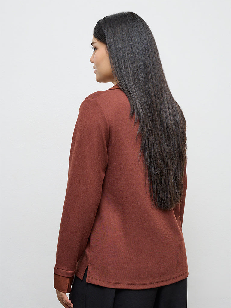 Gia introduces this brown t-shirt to add a polished appeal to everyday dressing. Crafted from a soft, lightweight fabric, it is finished with a ribbed texture that drapes comfortably on the frame. A collared is paired with full sleeves, keeping the look clean and understated.