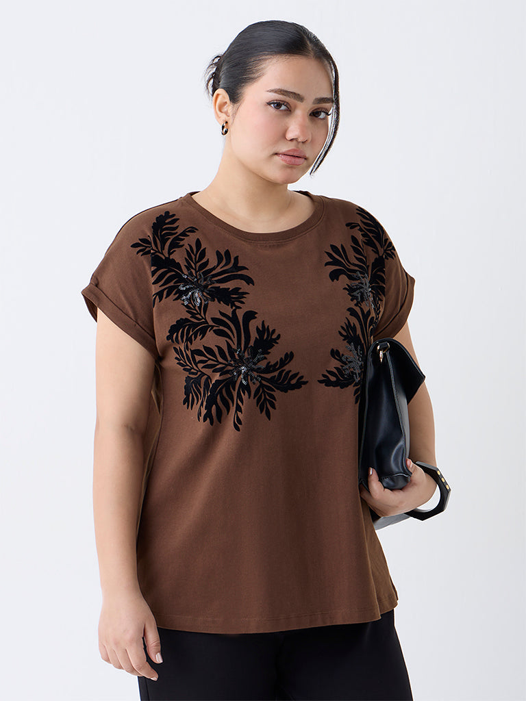 Gia Dark Brown Floral Pattern Cotton T-Shirt