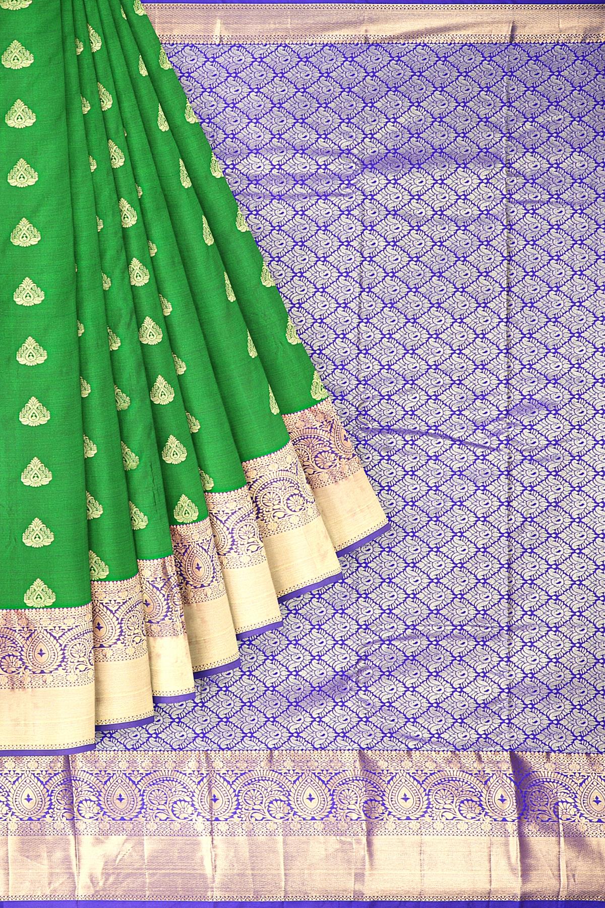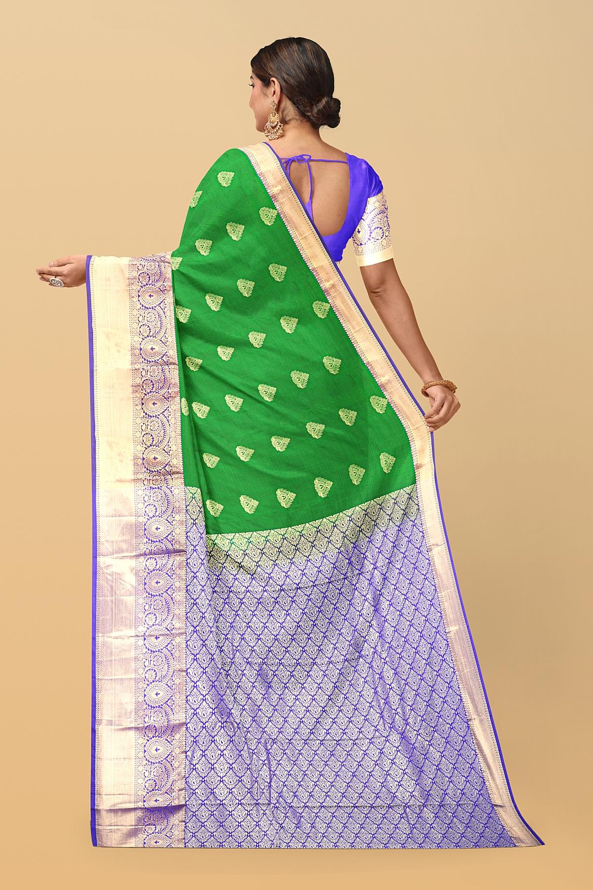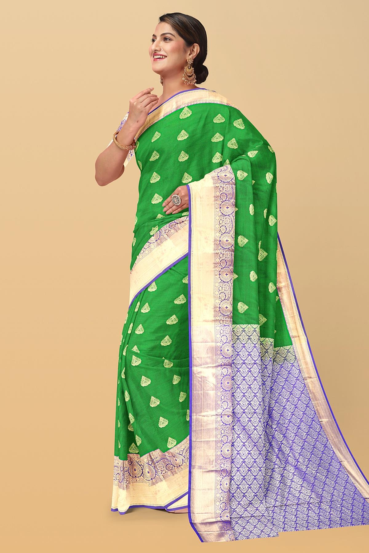 Latest GREEN BUTTIS SILK BLEND Saree with CONTRAST ZARI border. This saree comes with PLAIN WITH BORDER SILK BLEND blouse.