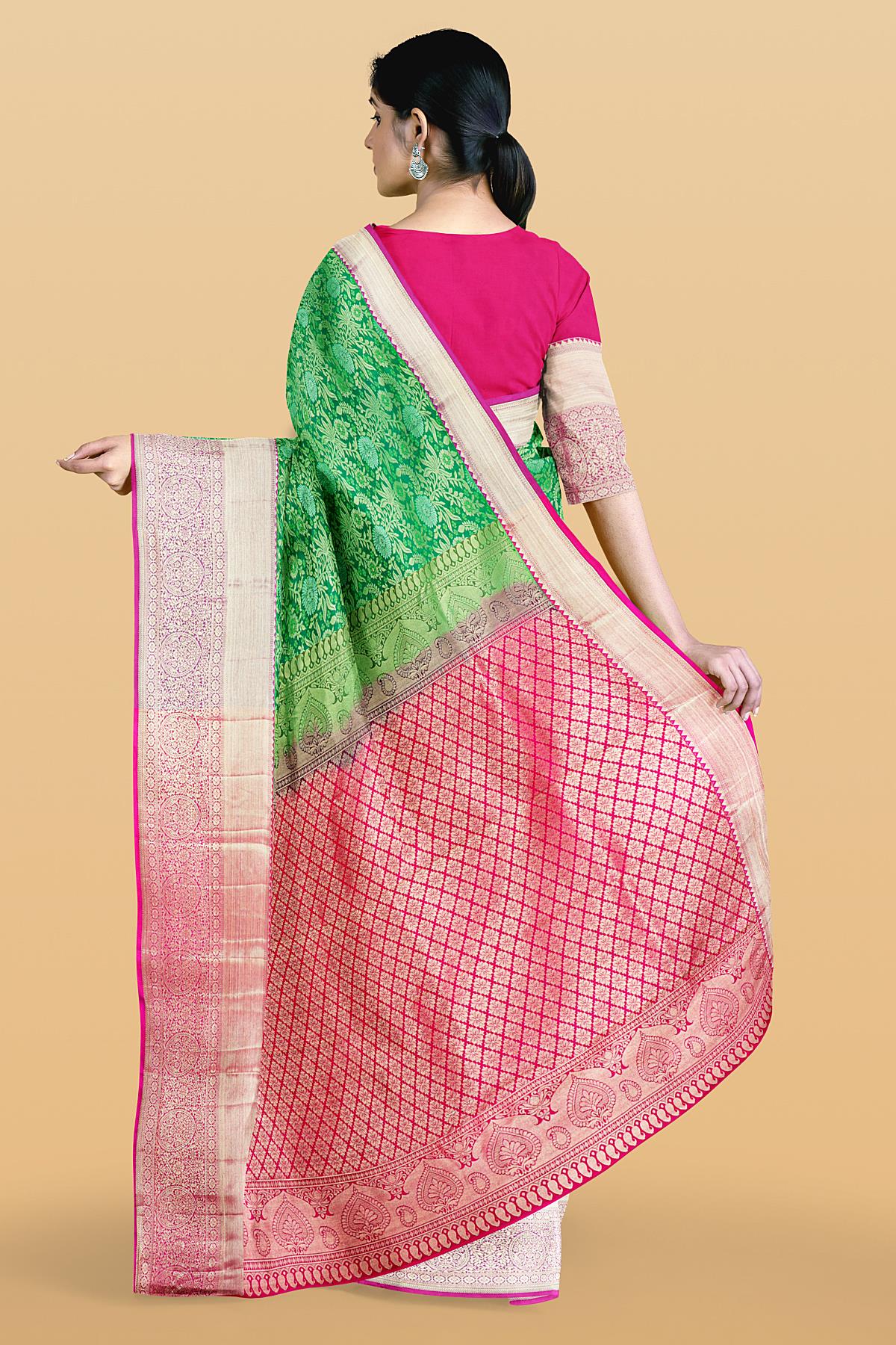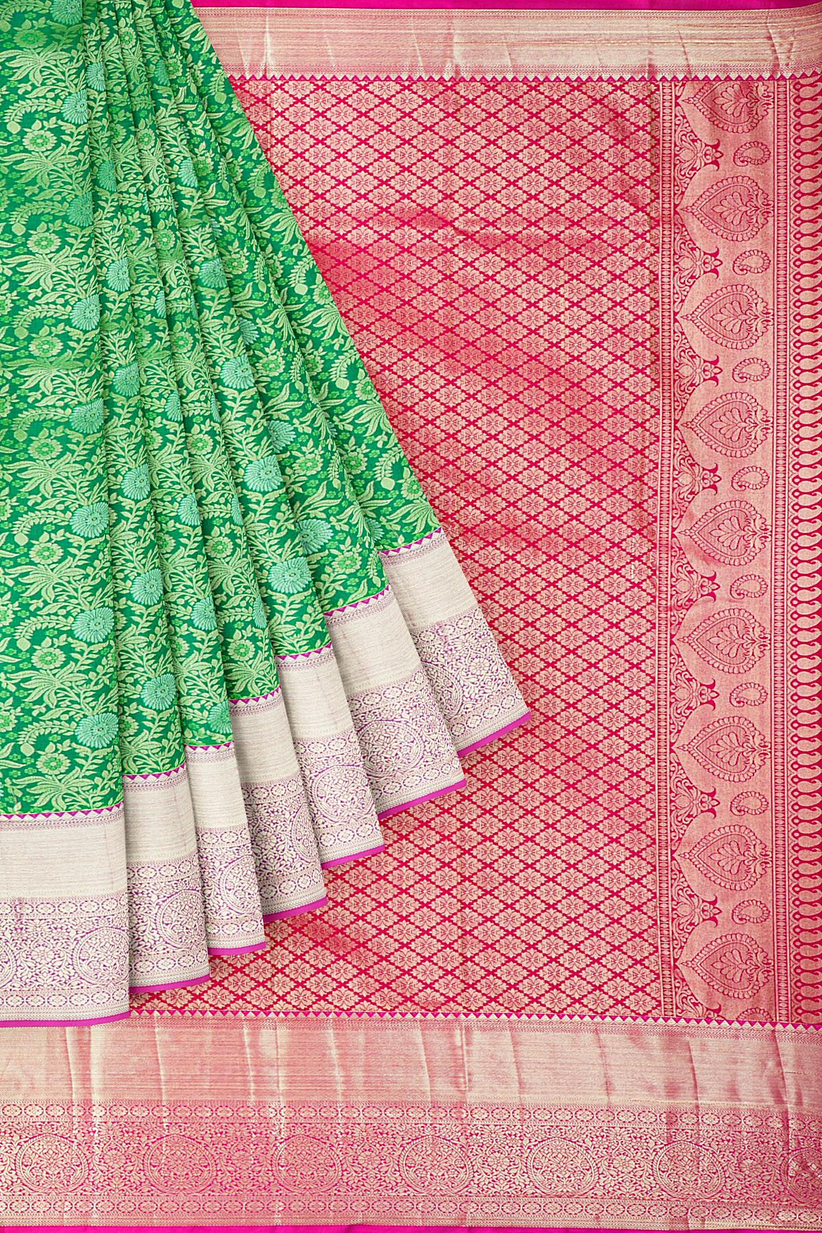 GREEN and PINK FLORAL JAAL SILK BLEND Saree with SEMI PATTU