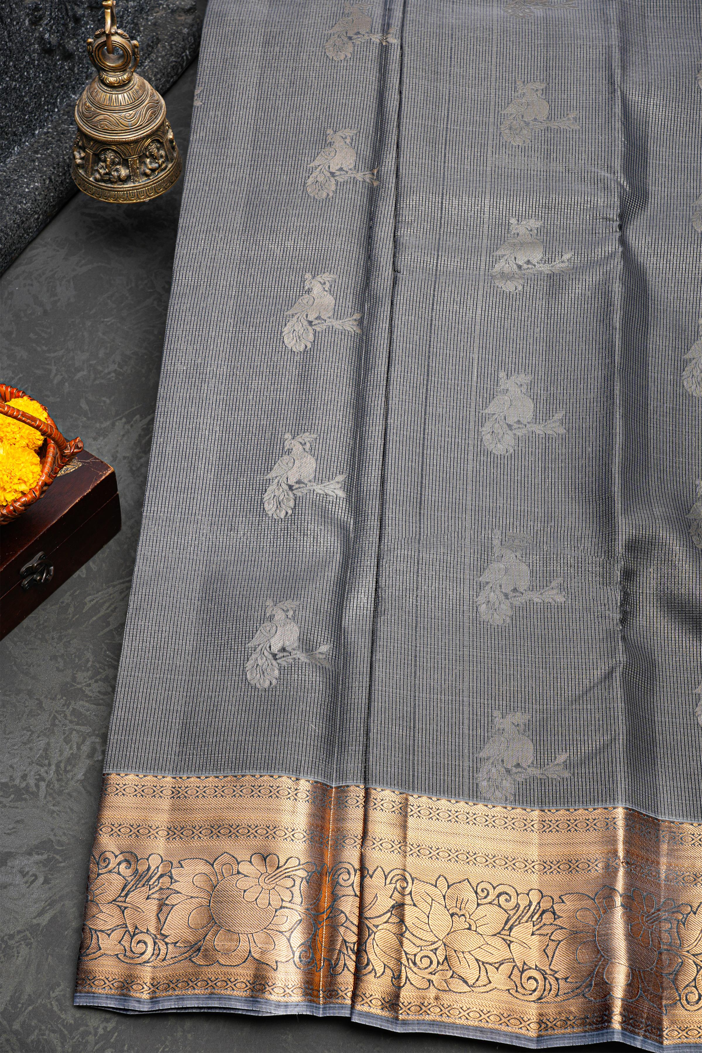 Latest GREY CHECKS AND BUTTIS SILK BLEND Saree with SELF ZARI border. This saree comes with PLAIN WITH BORDER SILK BLEND blouse.