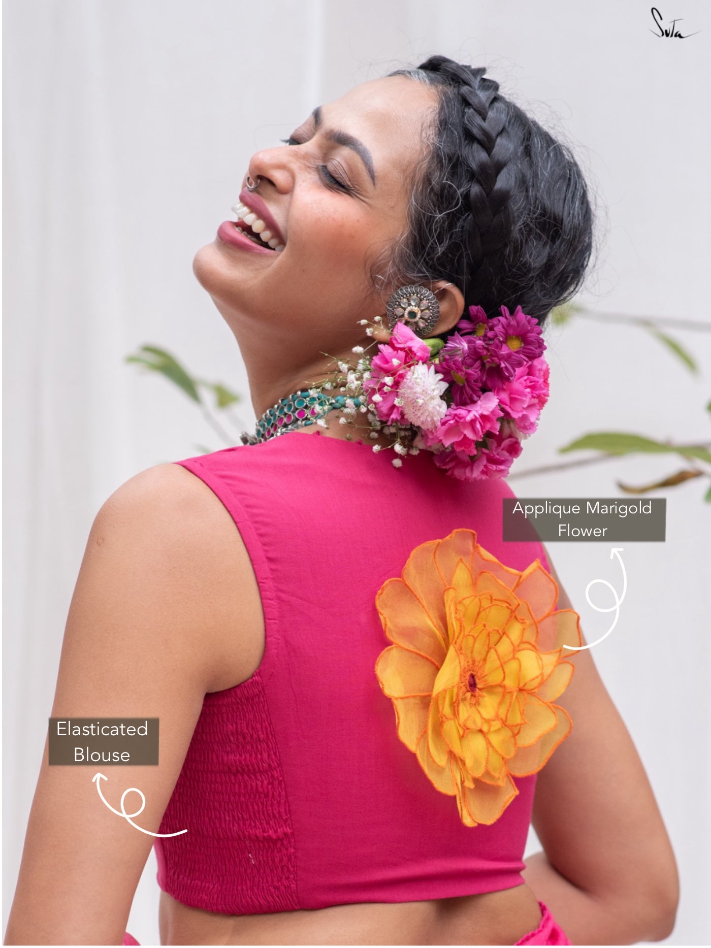 Sweet, feminine, and full of spring charm, this blouse stands out with a handcrafted marigold appliqué blooming softly at the back. The cotton cambric fabric keeps it light and breathable, while the U-neck, sleeveless silhouette, and side elastic ensure ease and comfort through the day.